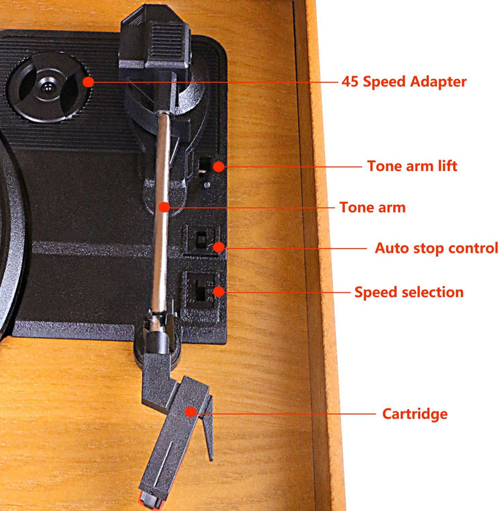 - ♬3-Speed-Plattenspieler: Der riemengetriebene Drehtisch spielt 33, 45 und 78 RPM-Rekorde in 7, 10 und 12 Zoll und mit einem tragbaren 45 RPM-Adapter.