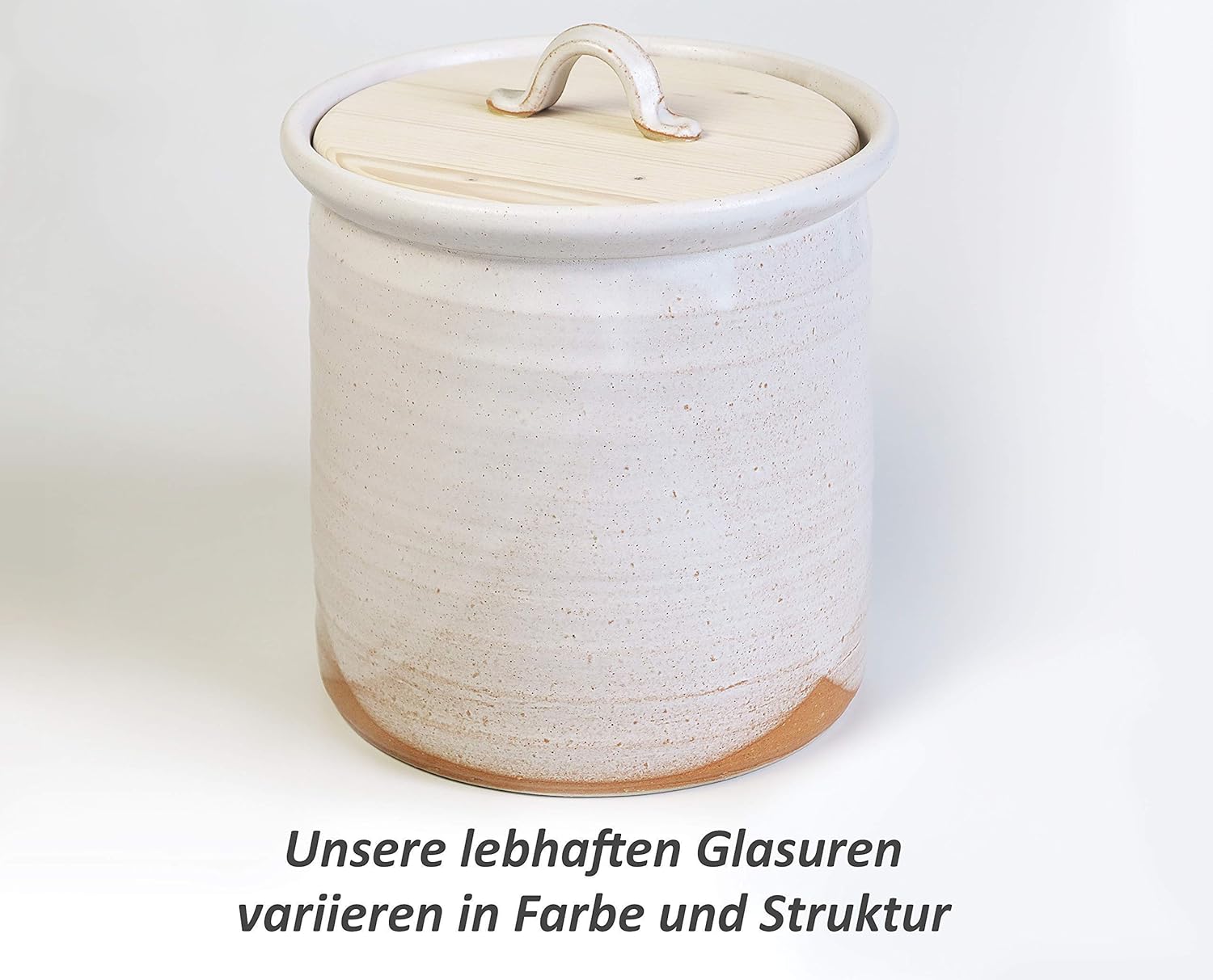 Dieses Hochformat ist durch die Anregung zahlreicher Kunden entstanden. Wenn Sie eine bis höchstens zwei Personen sind, eher halbe oder kleinere Brote bevorzugen und der Topf wenig Stellfläche beanspruchen soll, ist er genau das richtige für Sie. Ausserdem ist er für Brote aus Backautomaten beliebt. Wir haben gezählt, wie viel Brötchen durchschnittlicher Grösse Platz finden: Es waren 9 Stück. Materialien: Gefäss: 1300°C-Steinzeug mit Feldspatglasur (hoch-widerstandsfähig und abschlagsicher) Deckel: atmungsaktives, unbehandeltes Dreischicht-Fichtenholz, 13 mm (wichtig für den Feuchtigkeitsdurchgang), stossunempfindlich (jeden Tag sehr angenehm) Masse: Nutzvolumen gut 5 l Aussen-Ø ca. 21 cm, Innen-Ø an der engsten Stelle oben ca. 17 cm, Innen-Ø weiter unten ca. 19 cm, Höhe aussen ohne Griff ca. 21 cm, mit Griff ca. 25 cm, Nutzhöhe innen ca. 19 cm, Gewicht ca. 2,4 kg Pflege: Normalerweise genügt es, die älteren Brösel trocken auszuwischen. In unseren Töpfen herrscht optimales Klima, trotzdem hält sich Brot natürlich auch darin nicht unbegrenzt. Sollte doch einmal Brot schimmeln, waschen Sie den Topf mit Essigessenz (pur) aus und verteilen diese auch flächendeckend satt auf der Deckelunterseite. Lassen Sie’s einsaugen und in der Sonne trocknen, so verfliegt der Geruch schnell. Damit wird eventueller Schimmelpilz zuverlässig beseitigt. Der Brottopf ist, wie all unsere Keramik, absolut spülmaschinenfest, der Holzdeckel nicht.