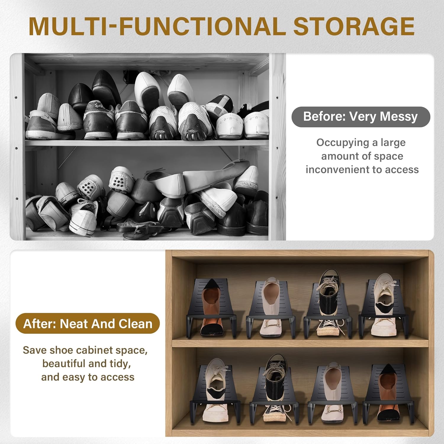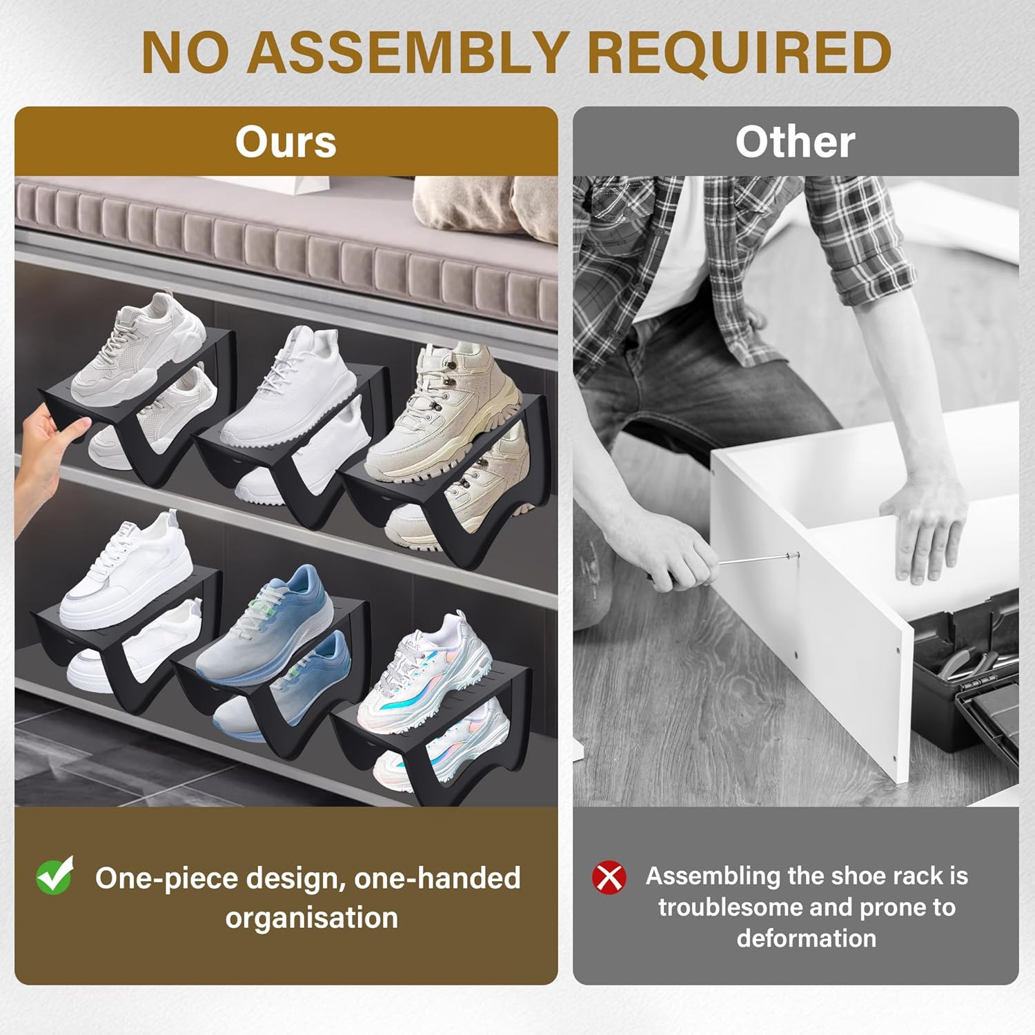 - Platzsparendes Design: Mit seinem innovativen, doppelstöckigen Aufbau ermöglicht dieser Organizer eine platzsparende Aufbewahrung von Schuhen. Zwei Ebenen bieten ausreichend Raum für ein Paar Schuhe, wodurch der Stauraum optimal genutzt wird. So