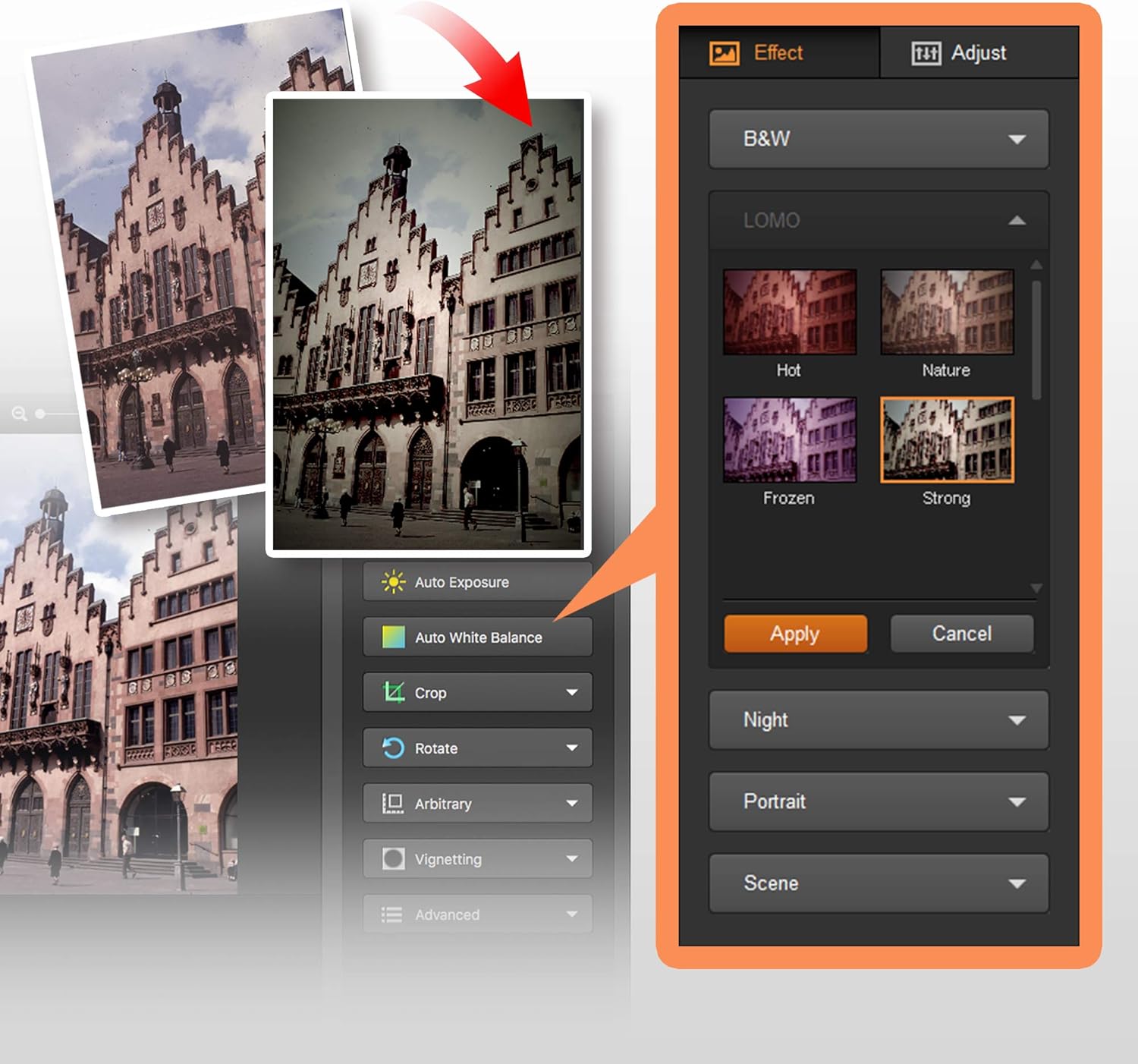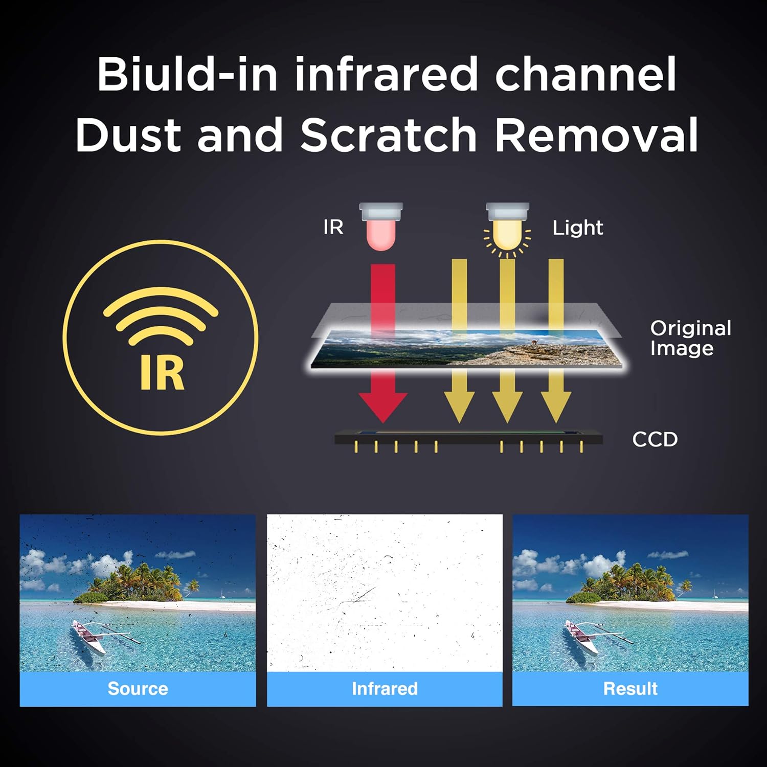 • Der eingebaute Infrarotkanal kann Staub und Kratzer auf der Oberfläche der Negative und Dias erkennen. Es ist sehr nützlich, um Fehler zu beseitigen, ohne die Bilder zu retuschieren.
