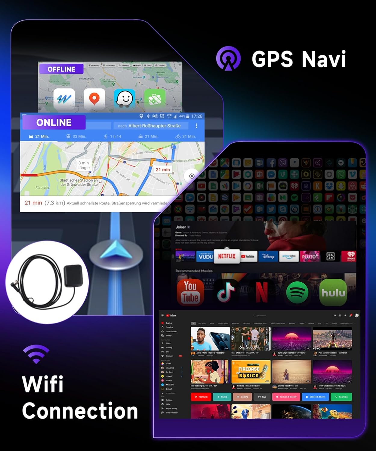- 【Autoradio mit Navi Online/Offline】Sie können online/offline Karte verwenden, mit der Hilfe von GPS-Antenne (im Lieferumfang enthalten), wird das Signal stärker sein. Der Speicher dieses Android 10 Systems ist 2(RAM)+32(ROM), Anwendungen können heruntergeladen werden, wie waze, youtube, Pandora, dann können Sie online Musik hören, wenn Sie fahren, Videos und Filme ansehen, wenn Sie allein im Auto sind.