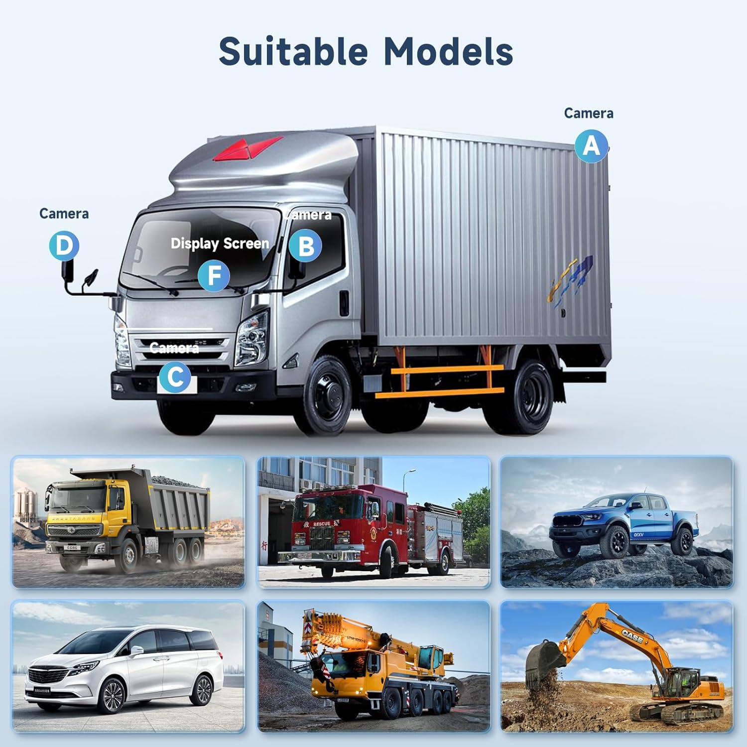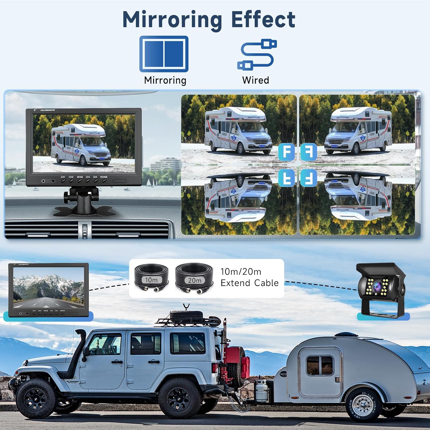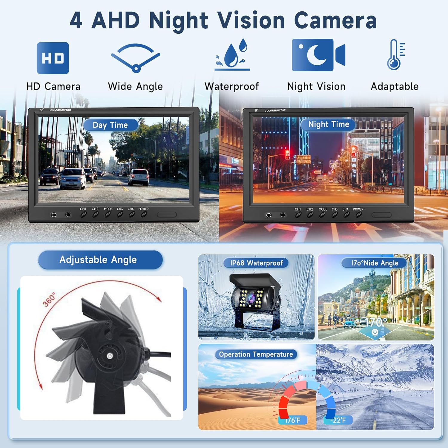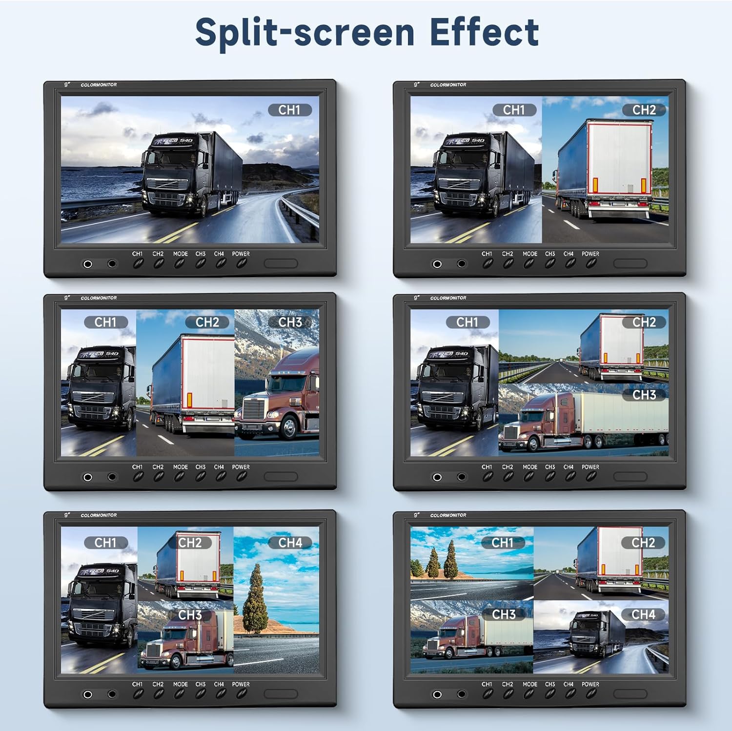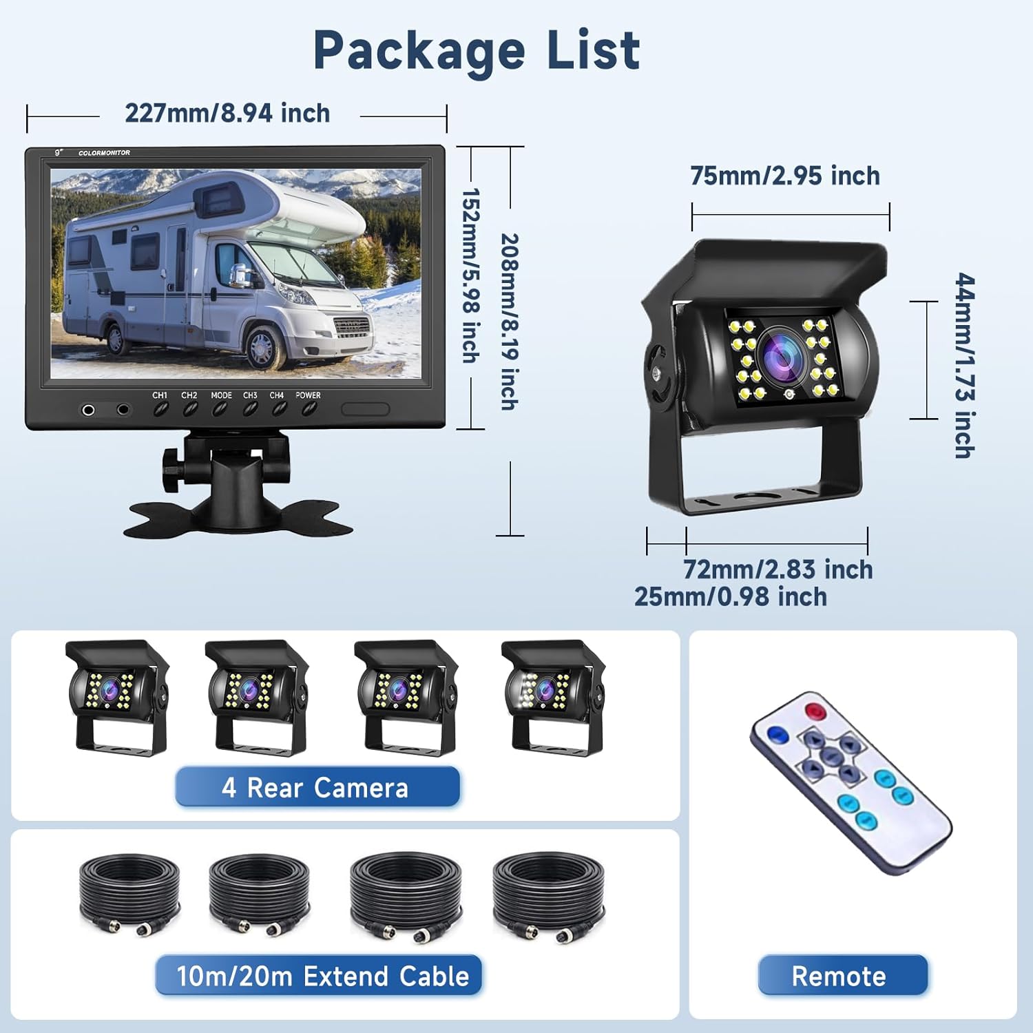 • 4*Rückfahrkamera Set Mit Monitor 9": 9-Zoll LCD Monitor mit 4 Rückfahrkameras mit 2x10 m + 2x20 m Kabel und 4-poligem Antennenanschluss für eine sichere und stabile Verbindung. Ausgestattet mit einer Fernbedienung (keine Batterien im Inneren).