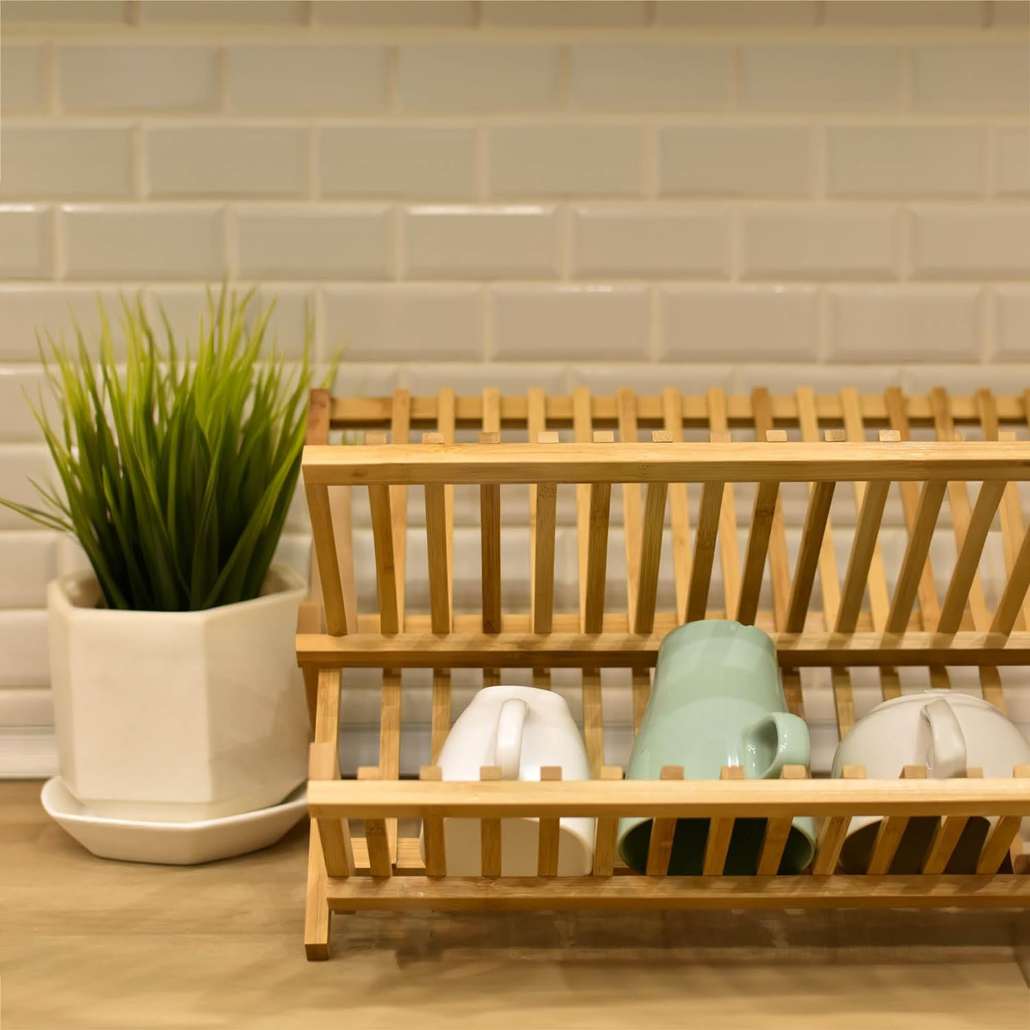 - DIMENSIONEN: Länge 42 cm, Breite 33 cm und Höhe 26 cm. Das robuste Abtropfgestell hat zwei Ebenen. Es gibt Platz für Pfannen, Geschirr und Besteck. Nach Gebrauch ist es dekorativ auf der Arbeitsplatte, aber auch leicht für die Lagerung einzuklappen.