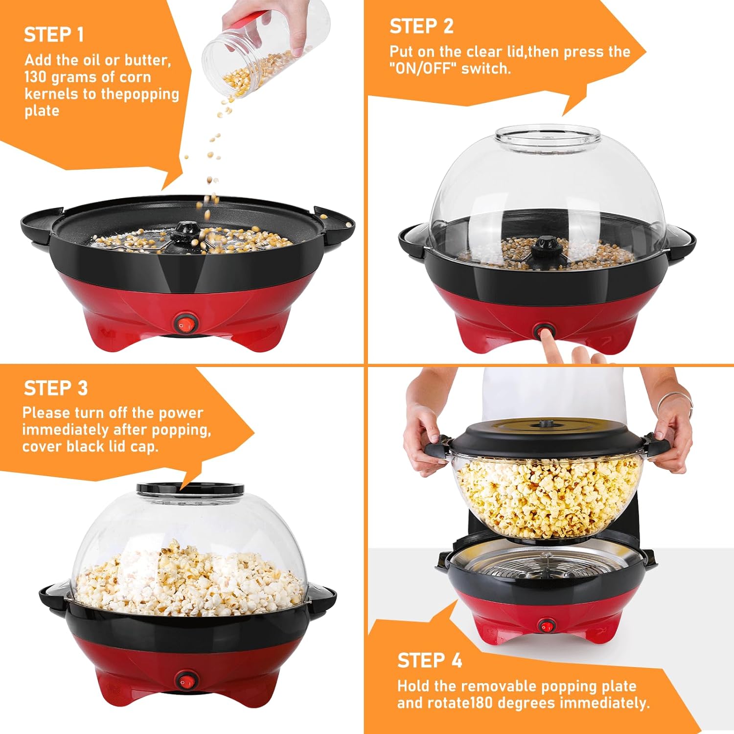- 【Elektrischer Rührer】Elektrischer Rührer mit Edelstahlstab, der das Popcorn und das Öl gleichmässig verteilt und die Popcorn-Popping-Rate verbessert. Macht 6 Quart 24 Tassen filmfrisches Popcorn für Ihre Familie und Freunde gleichzeitig in 5 - 6 Minuten für einen köstlichen Genuss.