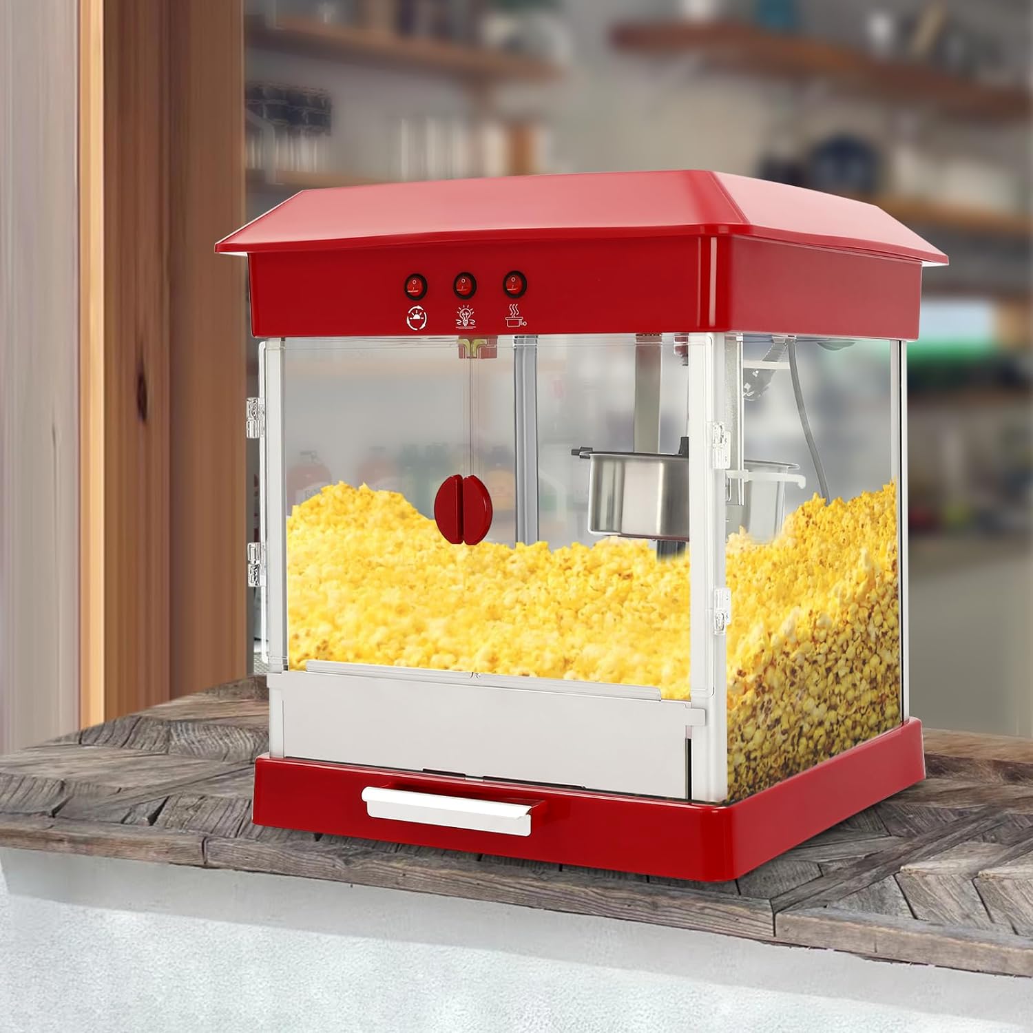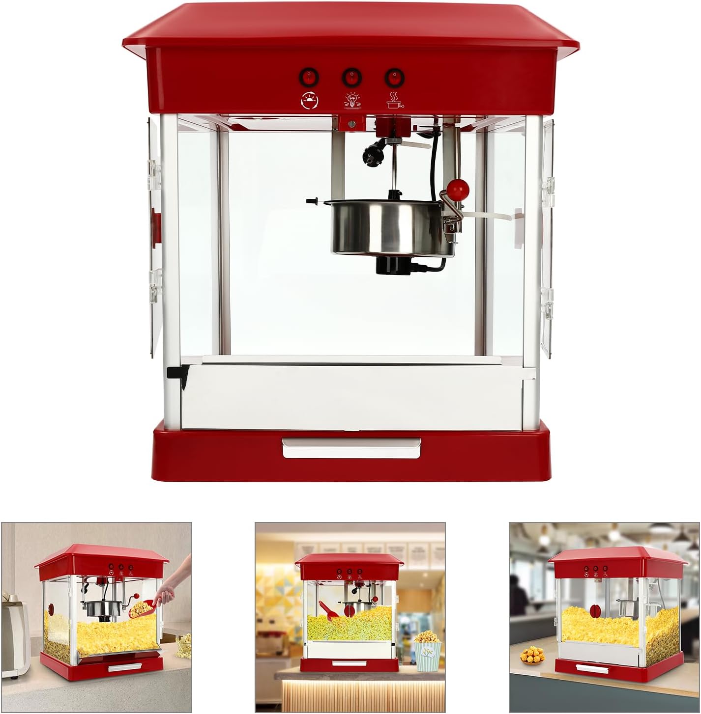 - Einfache Bedienung: Drei Tasten mit leicht verständlichen Diagrammen helfen Ihnen, die Beleuchtung, die Heizung und das Drehen leicht zu kontrollieren, um köstlichen Puffreis zu machen.
