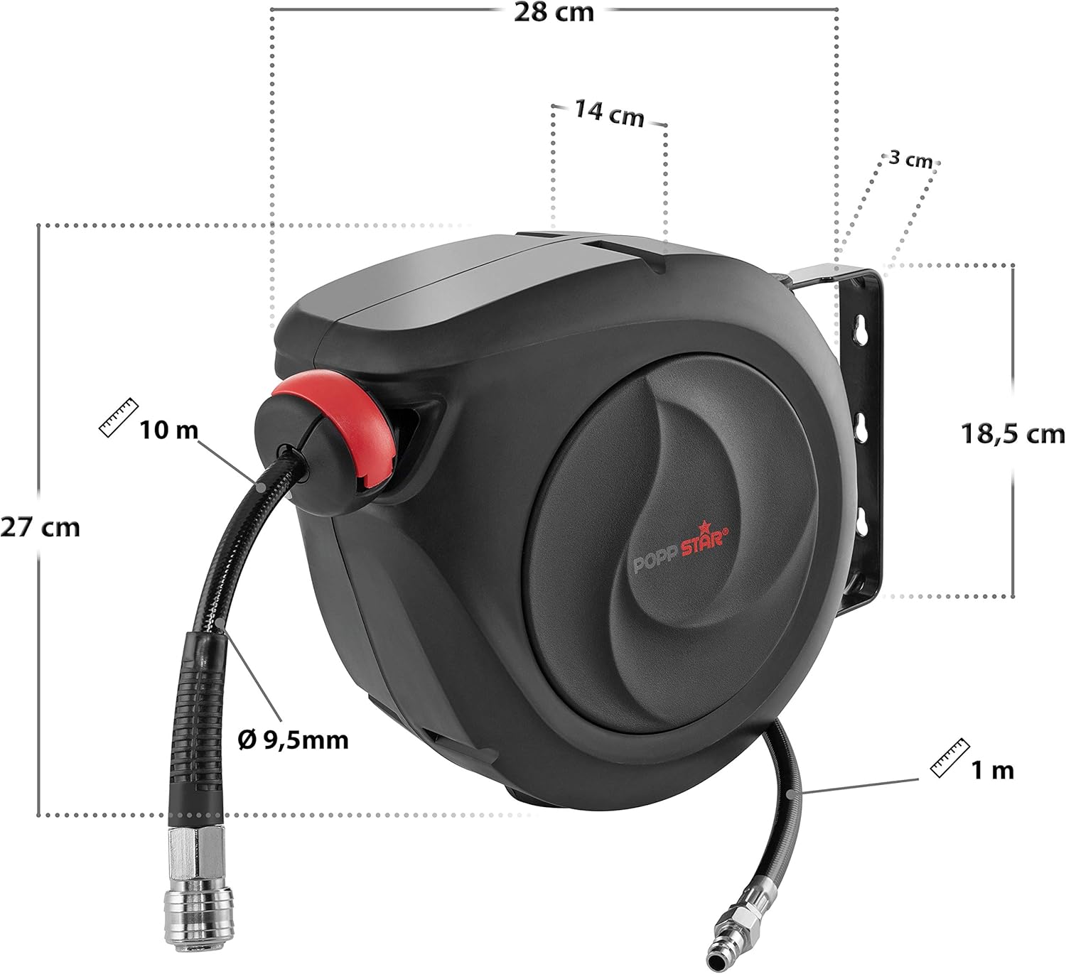 - Lieferumfang: 1x PREMIUM Druckluftschlauchtrommel (10 m + 1 m, Innendurchm. 5/16" (8x12mm), Anschluss 1/4" Schnellkupplung; mit Wandhalterung