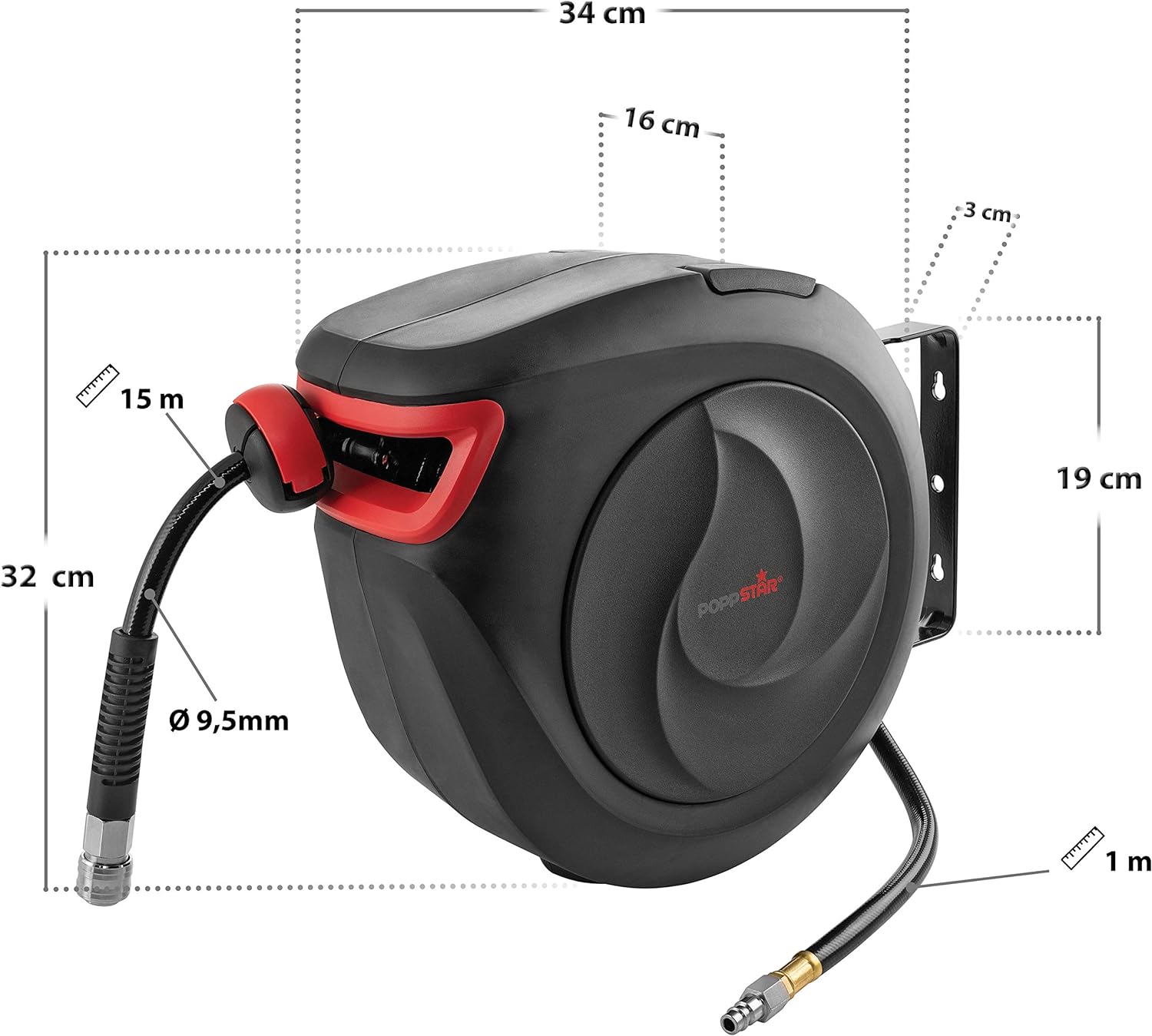 Poppstar Druckluftschlauchtrommel (15m+1m, Durchmesser 3/8" (9,5x15mm)) Schnellkupplung 1/4" BSPT |