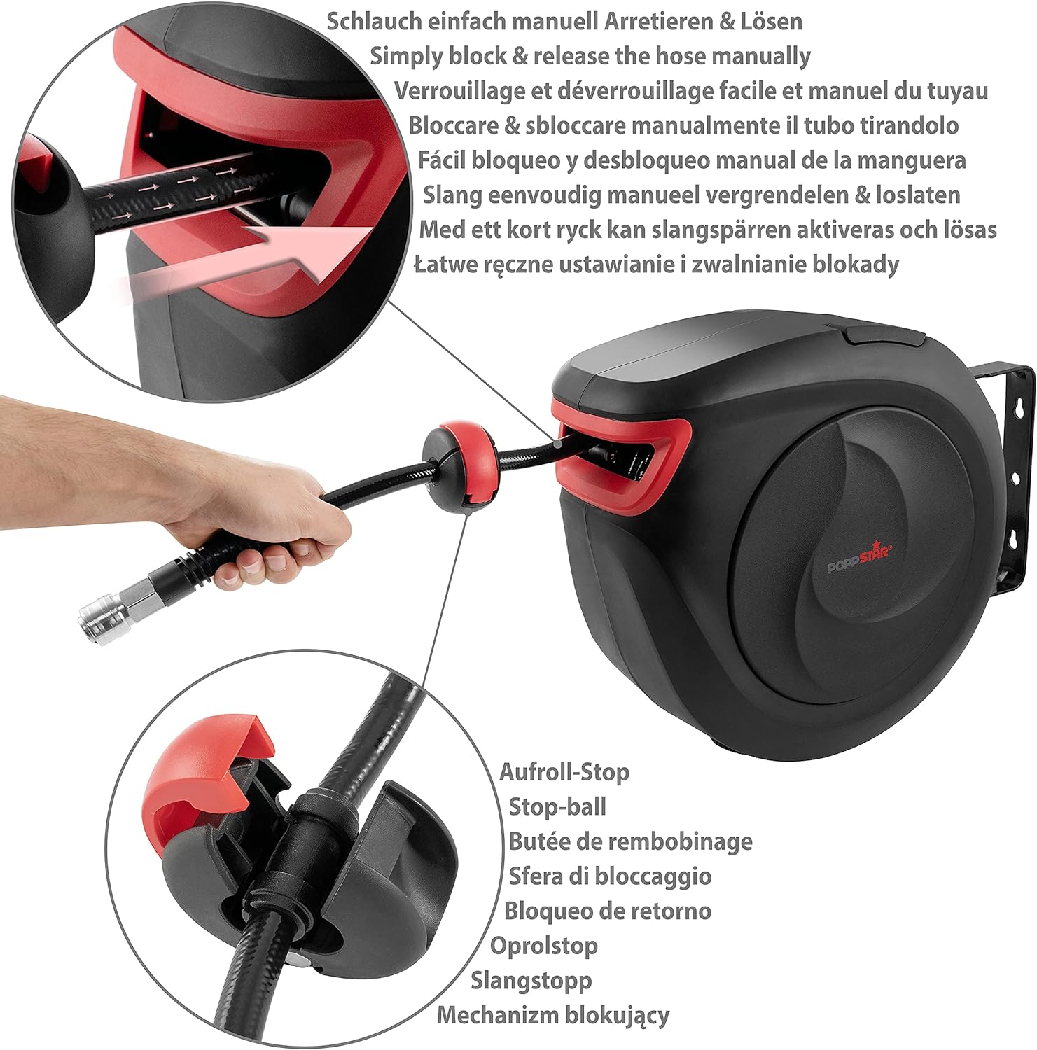 • Schlauchaufroller m. Aufrollautomatik, Luftschlauch Einzug mit Rücklauf-Stopp: einfaches manuelles Arretieren und Lösen des Schlauches