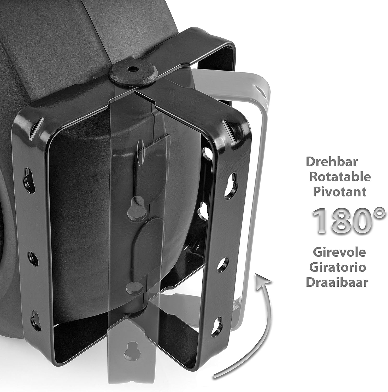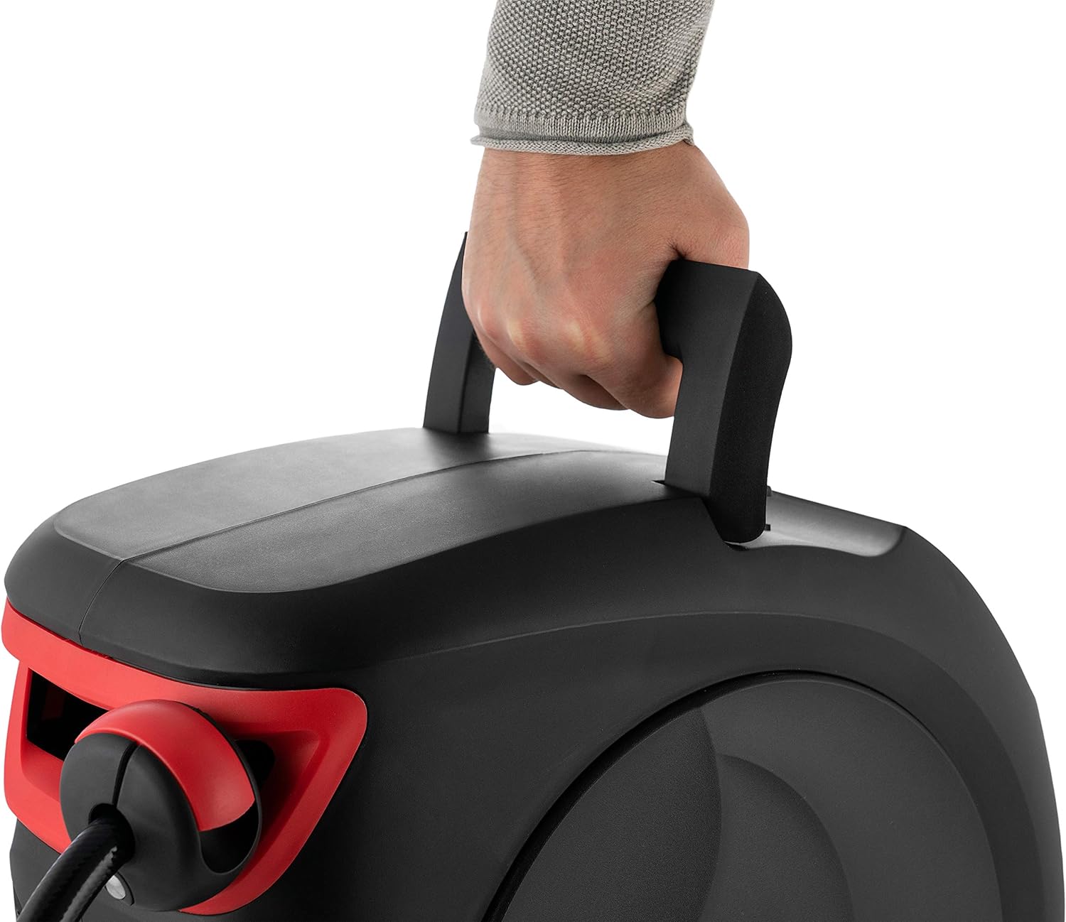 • Trommel mit robuster Eisen-Halterung für Wand-Montage, um 180° drehbar, Einlassadapter aus Aluminium, angenehmer Tragegriff