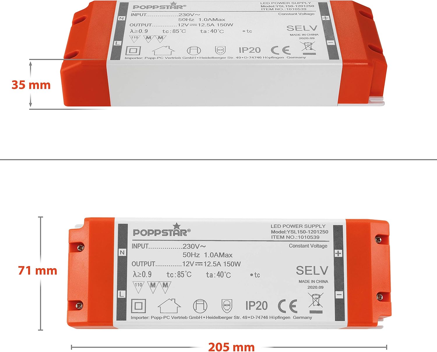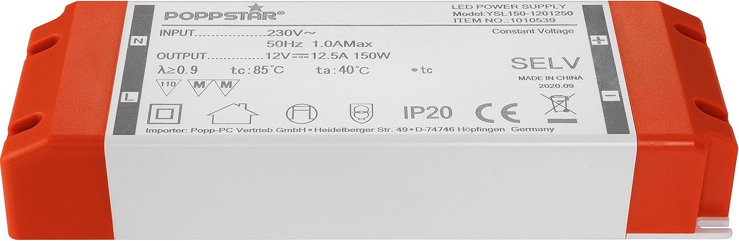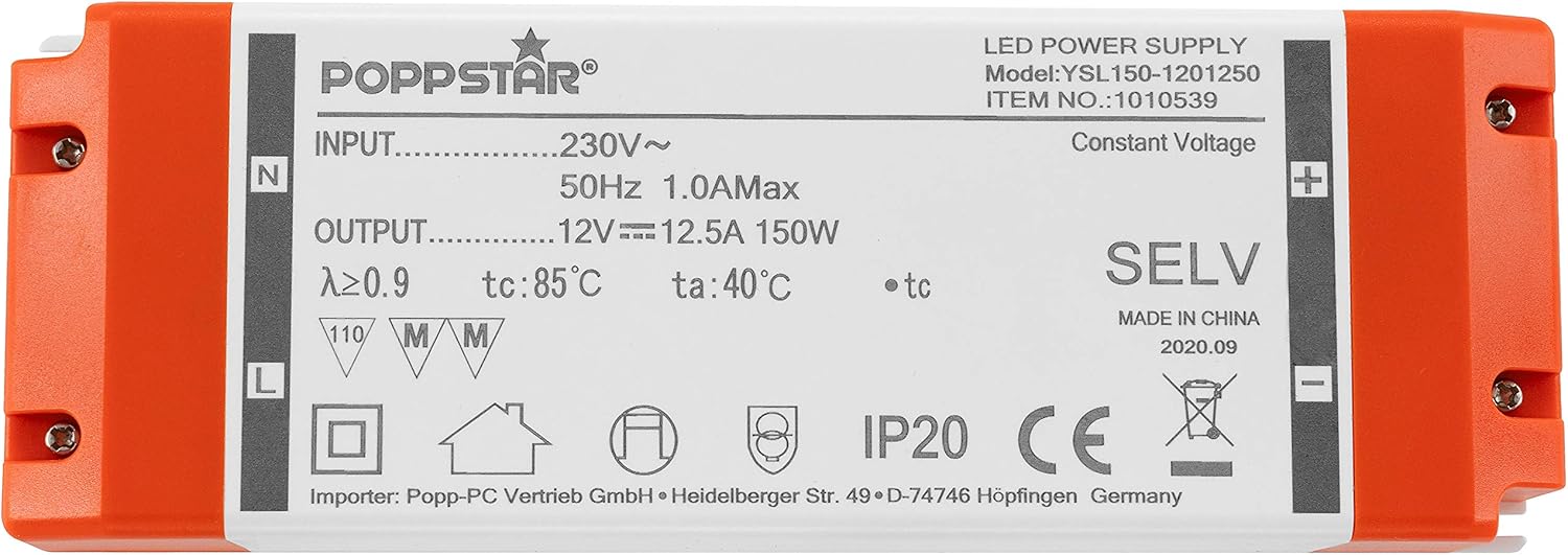 - Lieferumfang: 1 Trafo für LED Licht (Eingang 50Hz 220 V - 240 V AC 1,0 A / Ausgang 12 Volt 12,5 A max. 150 Watt)