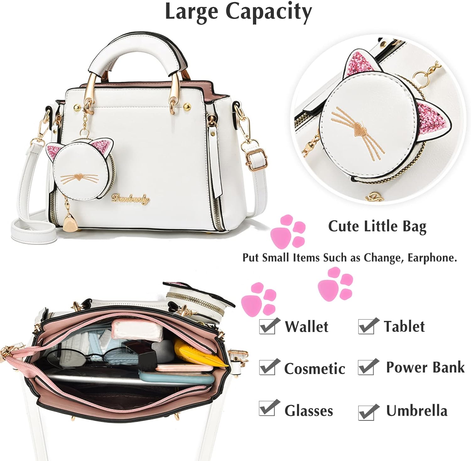 - 👜 Praktisch und Modisch - Die mitgelieferte Münzbörse in Katzenform kann nicht nur kleine Gegenstände aufbewahren, sondern kann auch als Ornament verwendet werden, um die Tasche süss und elegant aussehen zu lassen. Kommt mit einem abnehmbaren