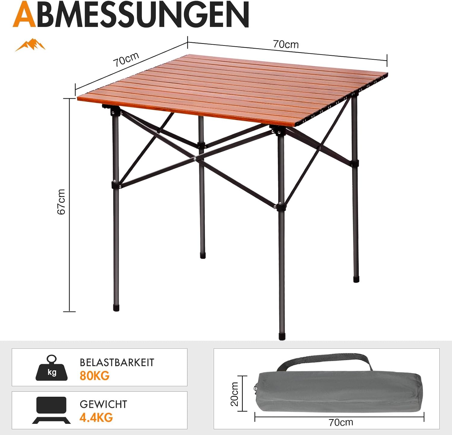 - [Tragbar und kompakt] Der Campingtisch wiegt 4,3 kg, Installationsgrösse 70 x 70 x 67 cm (LxBxH) und Faltgrösse 70 × 19 × 5,5 cm (LxBxH). Mit der Tragetasche können Sie es problemlos für Outdoor-Aktivitäten wie Camping, Wandern, Picknicks,