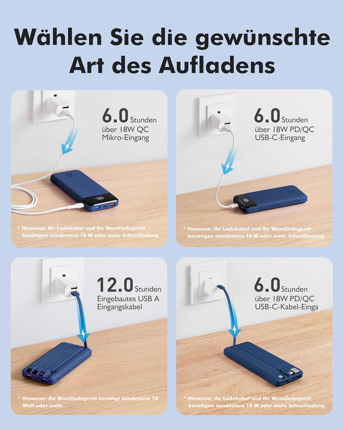 • 4 Eingabemethoden zur Auswahl: Mit zwei integrierten Eingangskabeln und 2 Eingangsanschlüssen können Sie verschiedene Kabel oder Netzteile verwenden, um die Powerbank so aufzuladen, wie es Ihnen am besten passt. Die Powerbank kann in nur 6 Stunden
