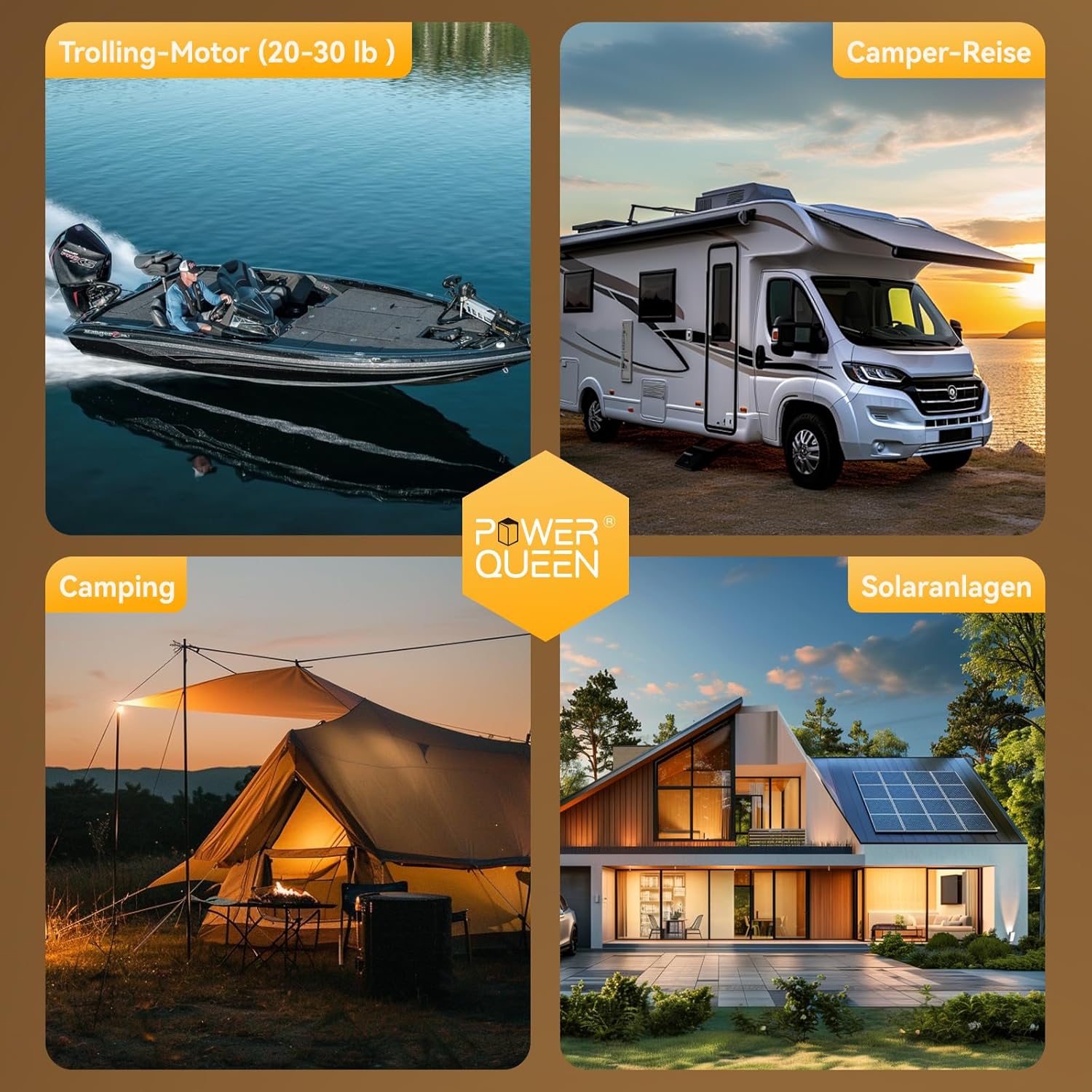 - Reihen- und Parallelschaltung: Die Power Queen LiFePO4 12 V 50 Ah kann bis zu vier identische Batterien in Reihe oder parallel aufnehmen (bis zu 4 Batterien können in Reihe/Parallel geschaltet werden), um eine maximale Kapazität von 200 Ah oder eine