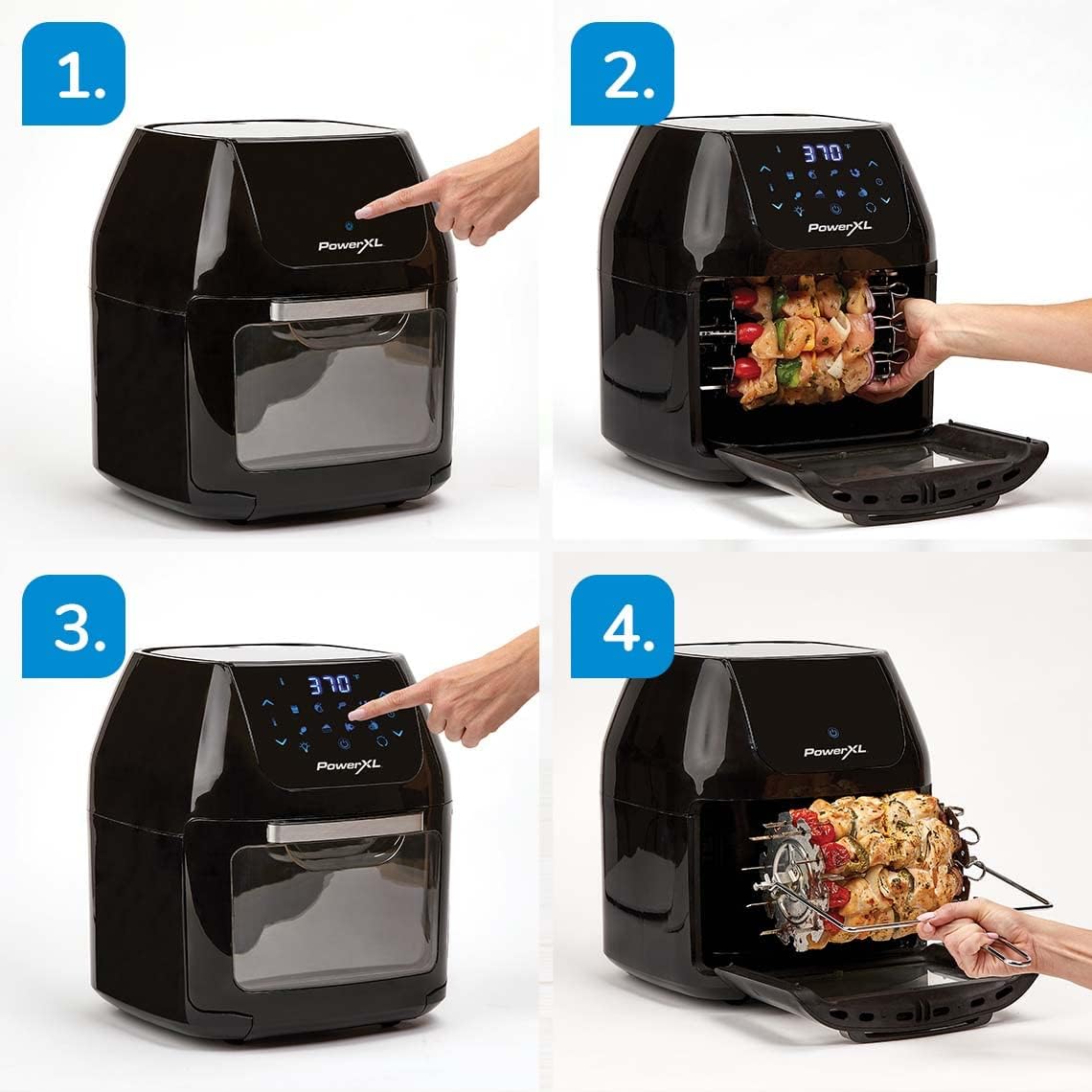• ✔ LIEFERUMFANG & DETAILS – 1x PowerXL AirFryer Multi-Function inkl. 5x Gitter, 1x Frittierkorb mit Haltegriff, 1x Grillständer, 3x Rezeptheft, 1x Drehkorb, 1x Grillspiess, 10x Spiesschen