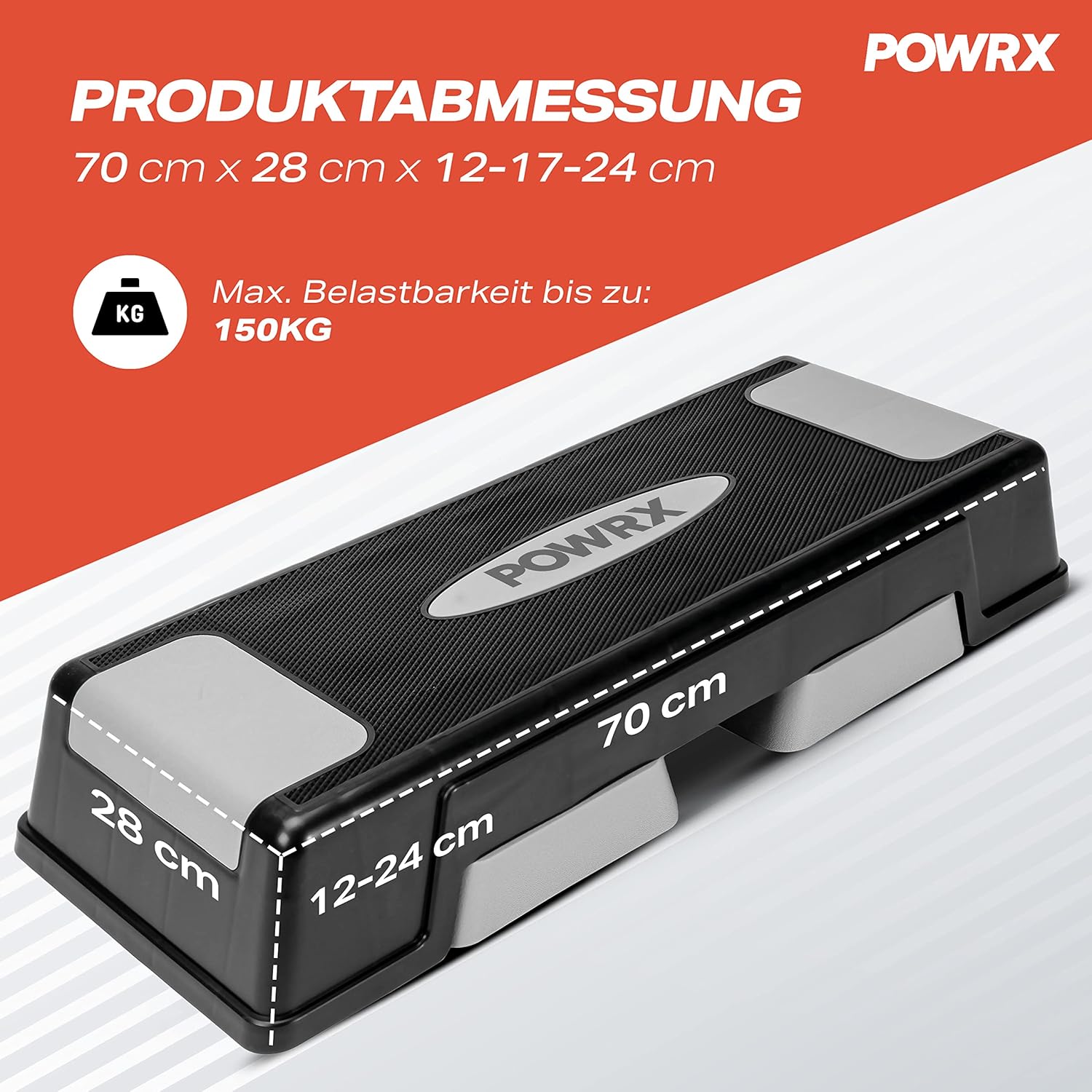 - Produkt - 1 x POWRX Steppbrett höhenverstellbar; Masse L/B/H 70 x 28 x 12/24 cm | L/B Steppfläche: 63 x 24 cm | Link Workout Poster per Mail in Ihrer Versandbestätigung.