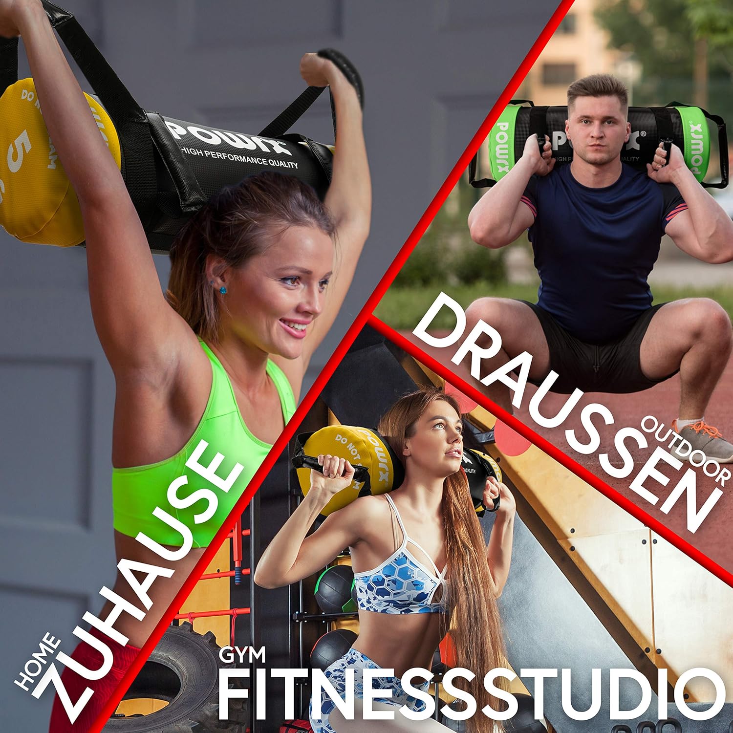 - PRODUKT - 1 x POWRX Power Bag I Farbe: Schwarz-Dunkelgrün I Masse: 57 x 22,5 cm I Material: Kunstleder I Füllung: Tücher und Metallsand I Gewicht: 25 kg I Inkl. Link interaktive Trainingsbibliothek mit über 360 Übungen per Mail in Ihrer