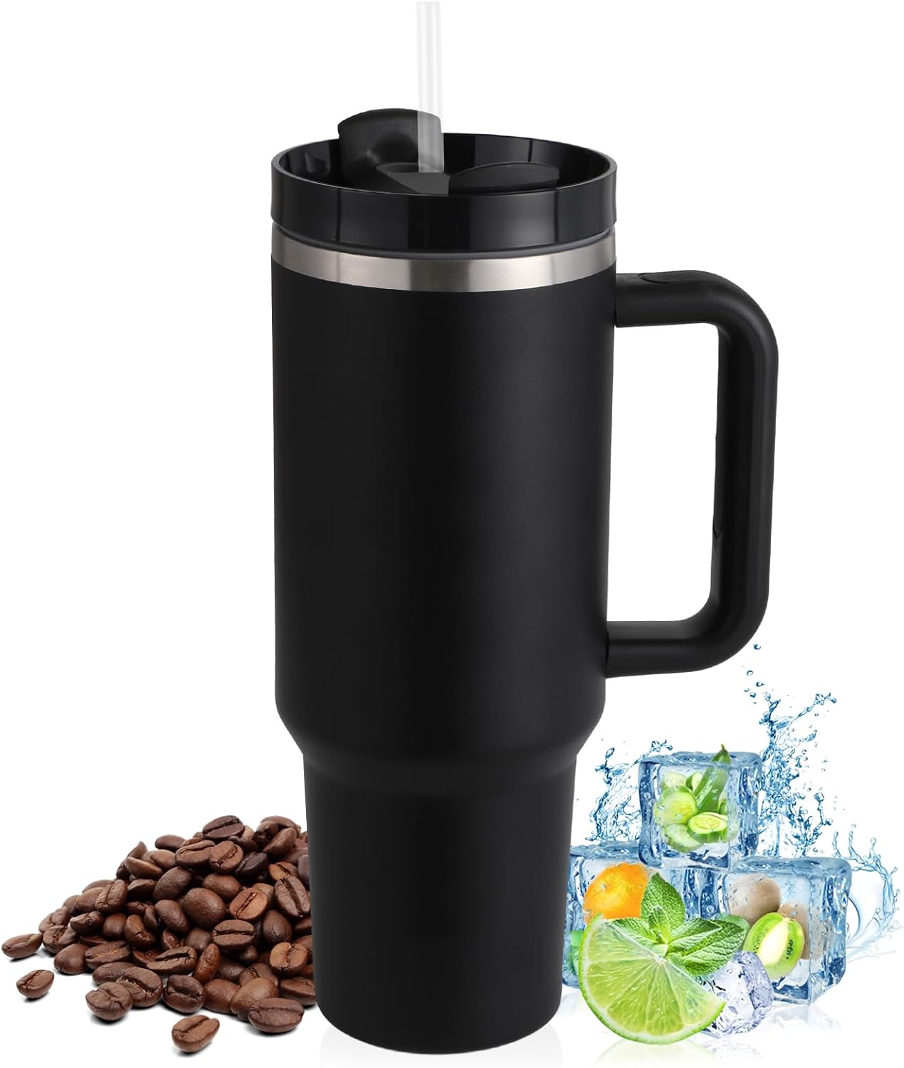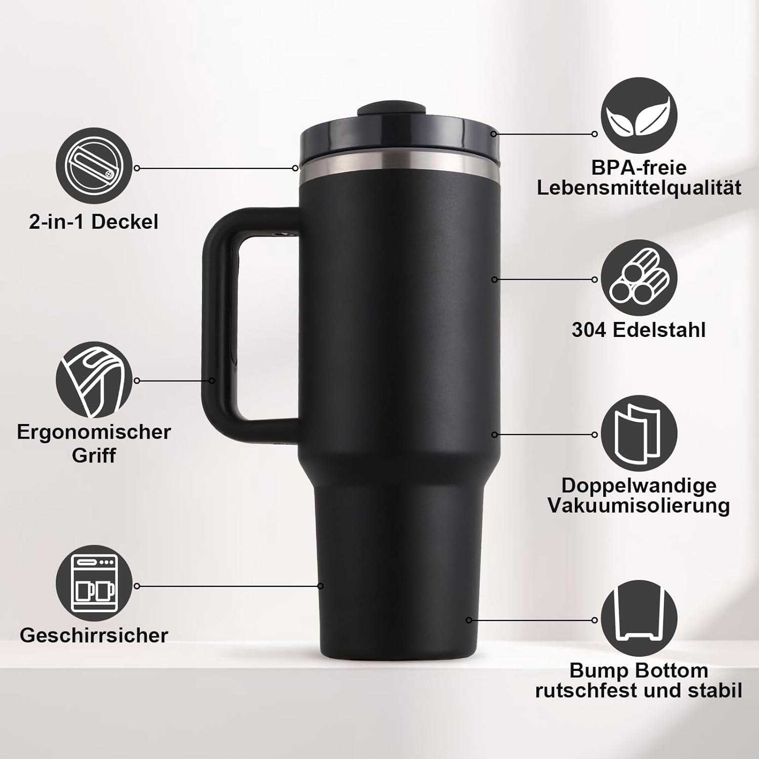 Praoahei 40oz Thermobecher mit Strohhalm und Henkel,1180 ML Doppelwandiger Edelstahl Heisse Kalte Ge