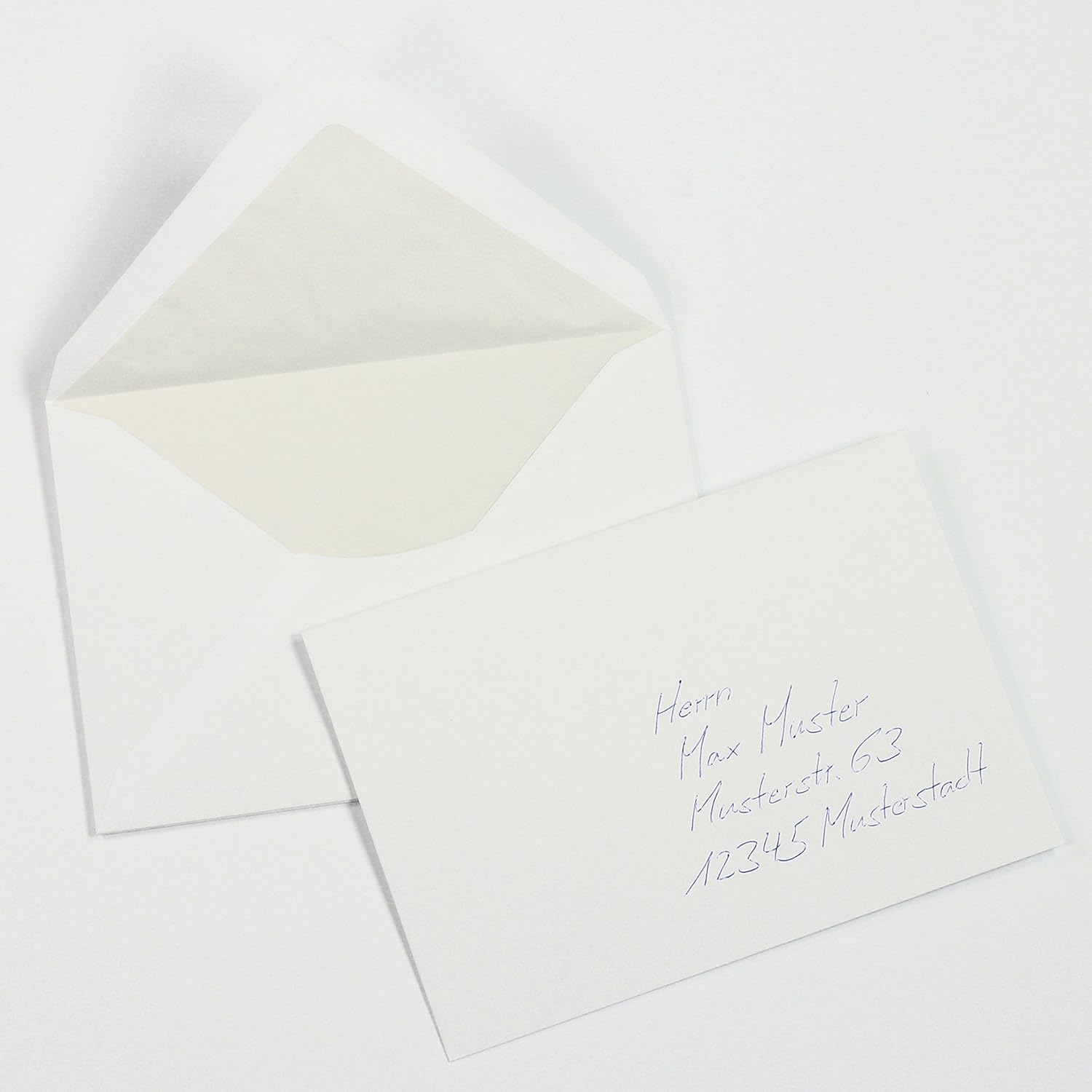 - aussen HOCH-WEISS, innen leicht cremefarben gefüttert, nassklebend, mit dem Innenfutter entspricht das Material ca. 100 g/qm. Ein Umschlag wiegt ca. 4,8 g.