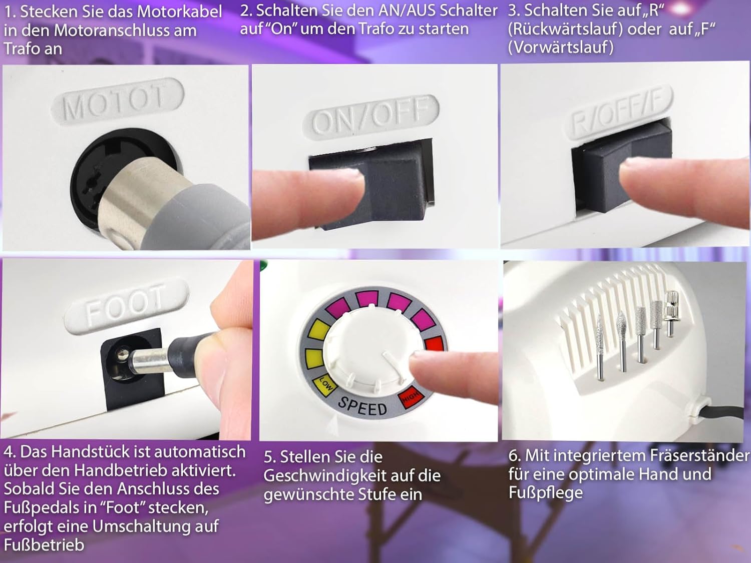 - PREMIUM Fusspflegegerät mit Schleifer - Diamantschleifer-Set zur Hornhautentfernung. Fusspflegegerät als elektrische Nagelfeile zur Maniküre und Pediküre. Für alle gängigen Diamantschleifer, Hornhautfräser, Filzpolierer, keramische
