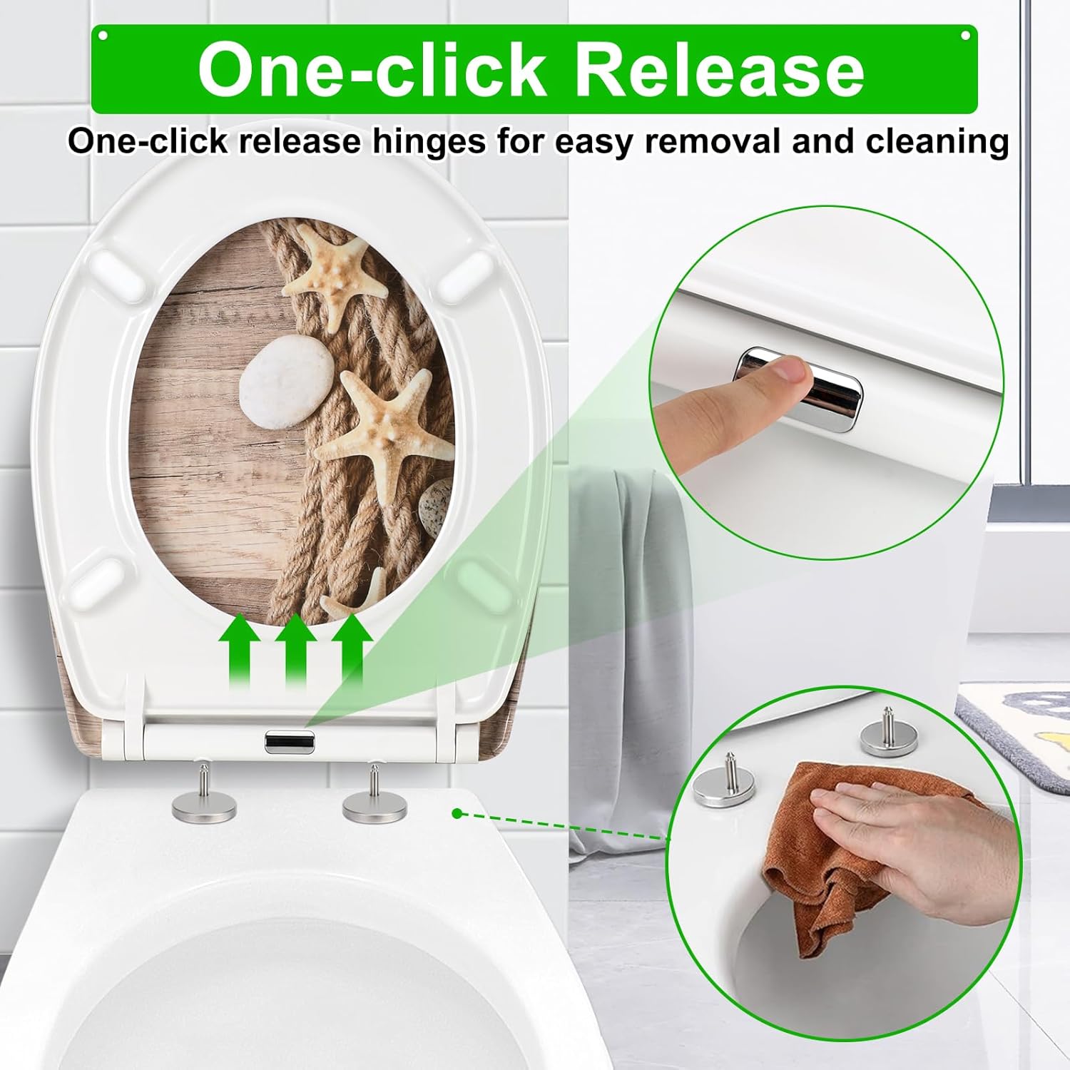 - Einfache Installation und schnelle Installation und schnelle Demontage mit einem Tastendruck: Dehnschraube einsetzen, runde Basis anpassen, Schraube festziehen und den Toilettensitz installieren. Die Installation ist innerhalb von 5 Minuten