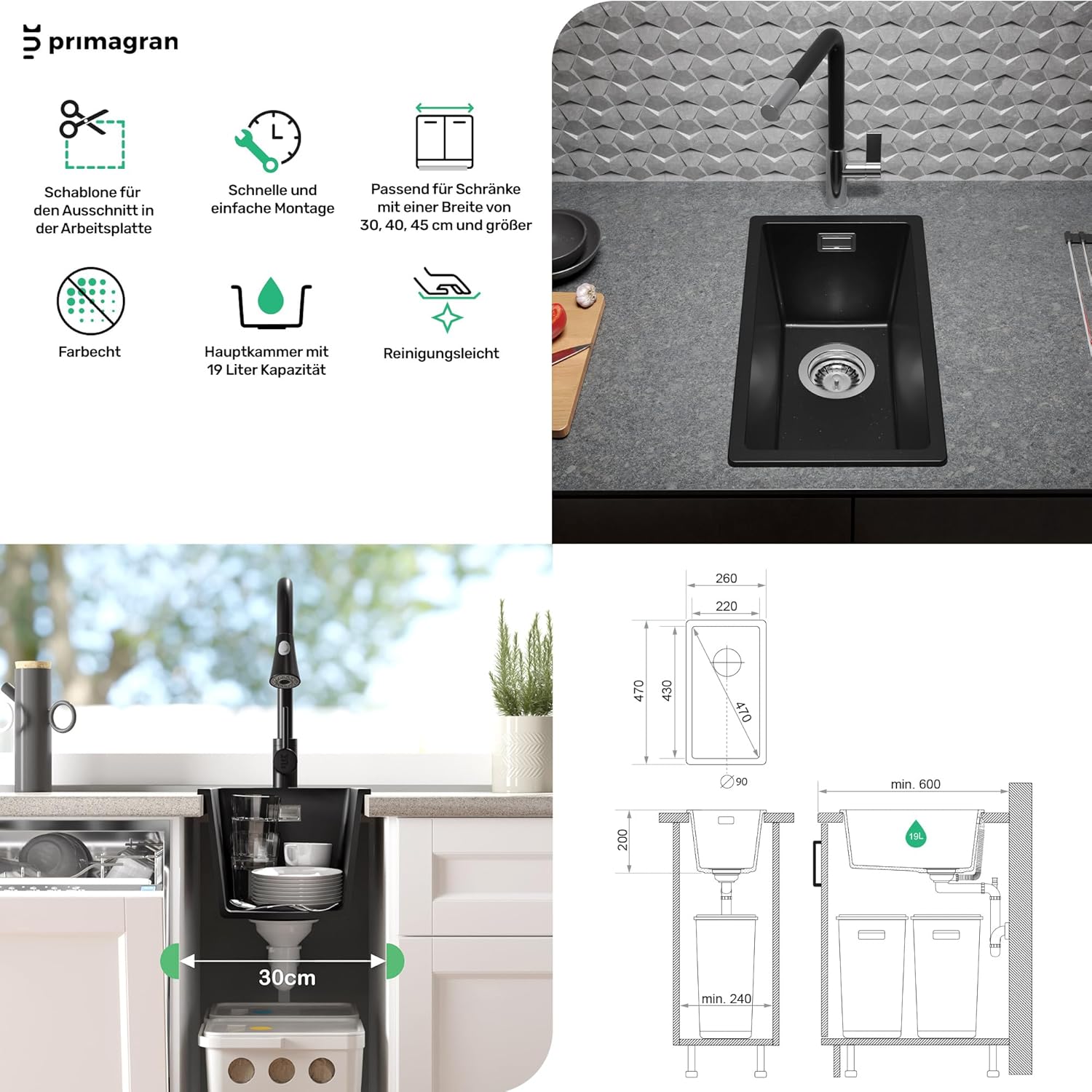- 🔨 Im set - Spüle London 30 Slim, komplettes Abflusssystem (hochwertiger Siphon, Überlauf, zusätzlicher Abfluss für den Anschluss an Waschmaschine oder Geschirrspüler).