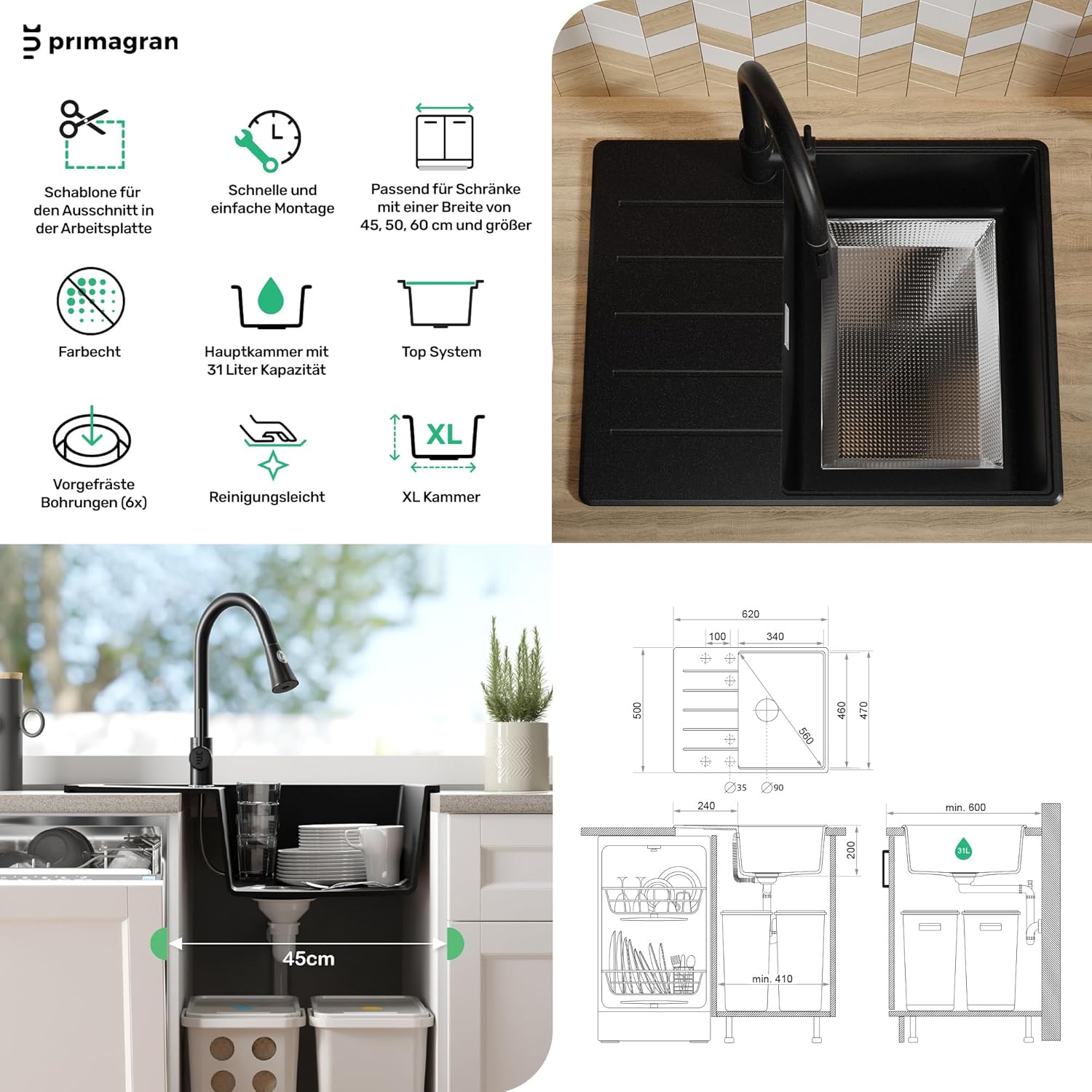 - 🔨 Im set - Spüle Kopenhagen 620-45, komplettes Abflusssystem (hochwertiger Siphon, Überlauf, zusätzlicher Abfluss für den Anschluss an Waschmaschine oder Geschirrspüler).