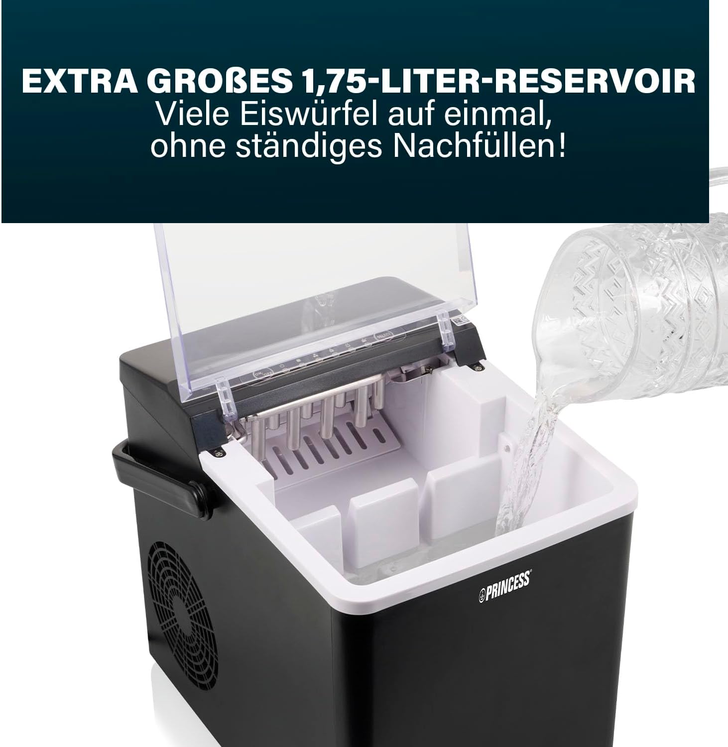 - Mit der Princess-Eiswürfelmaschine bereiten Sie in nur 6 Minuten bis zu 9 Eiswürfel zu. Wählen Sie zwischen zwei Eiswürfelgrössen – ideal für Partys, Aperitifs oder erfrischende Getränke zu Hause.