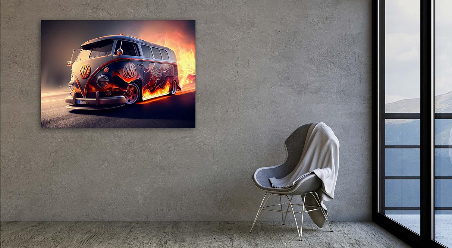 PRINTONIA Bilder Leinwandbild 120x80cm VW Volks Wagen T1 Gurke VAN Auto Abstrakte Kunst Kunst Neon
