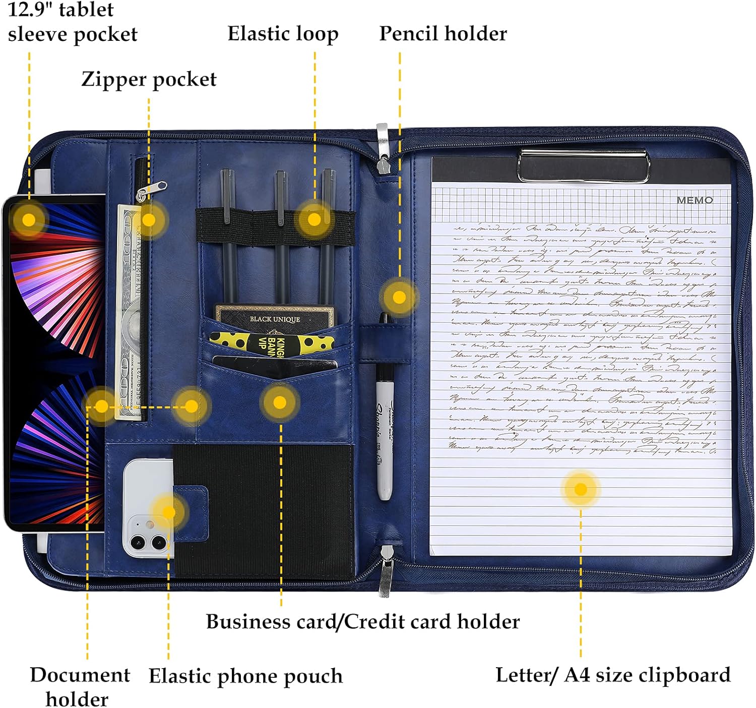 - 📂 Genug Stauraum: Separater Notizblock mit Schreibpapieren, Fächern für Karten, Stifte, offene Tasche für Tablets bis 13 Zoll, Reissverschlusstasche für geheime Dokumente