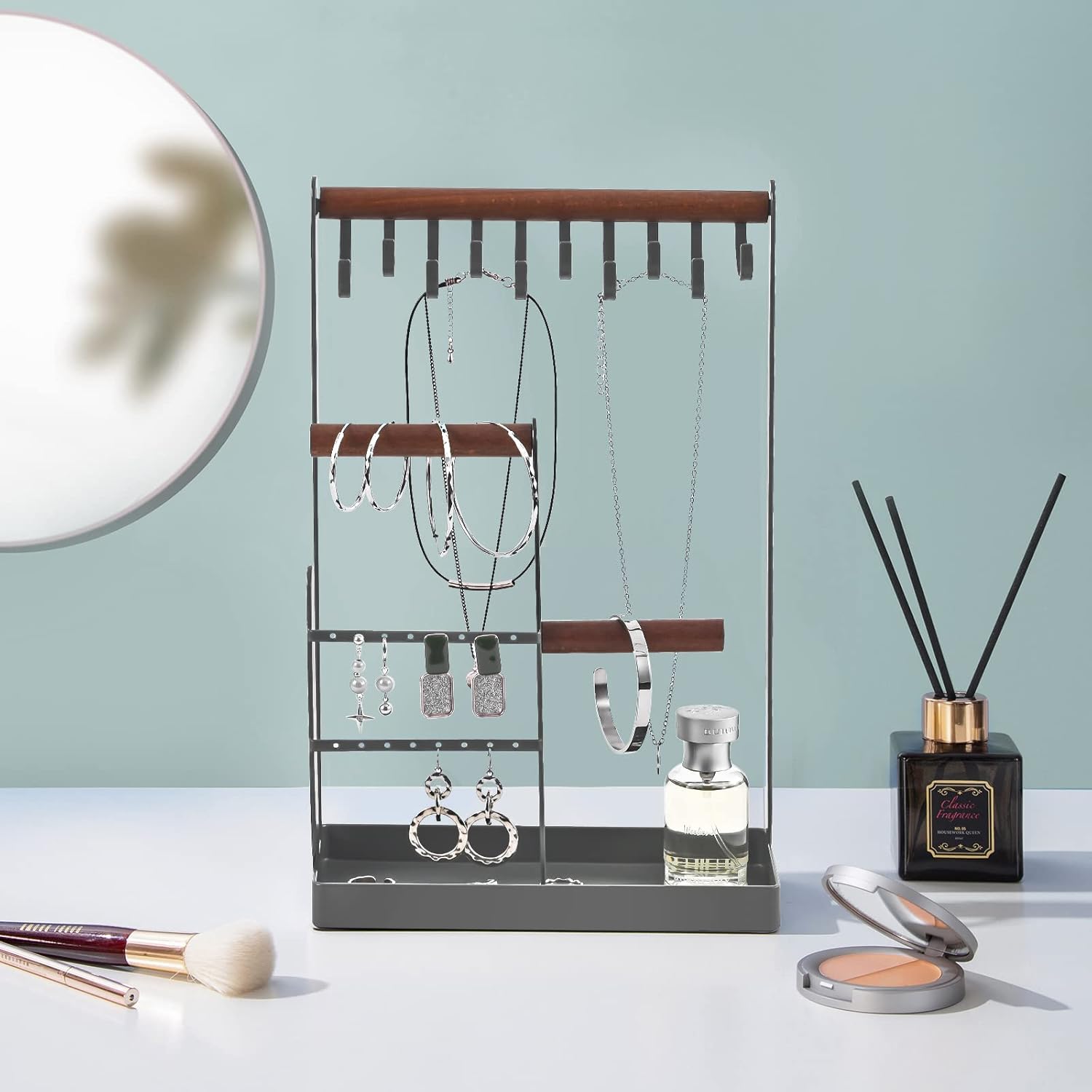 - ✅ Einfach Design - 10 Haken für Ketten; 16 Ohrringlöcher für Ohrringe; 2 Holzbalken können Ringe, Armbänder und Uhren organisieren; Unteres Tablett kann Lippenstift, Mini-Parfüm und andere kleine Gegenstände aufbewahren
