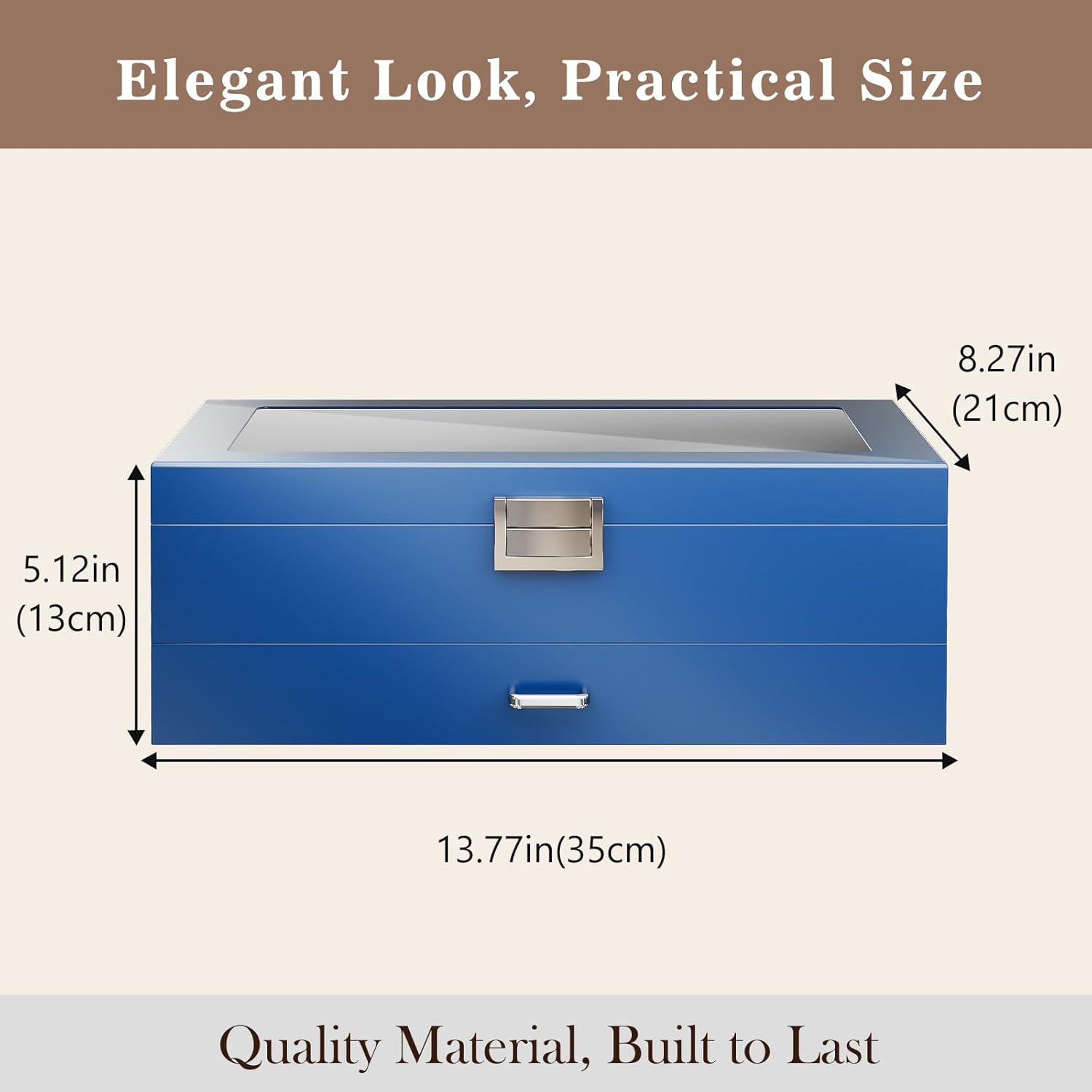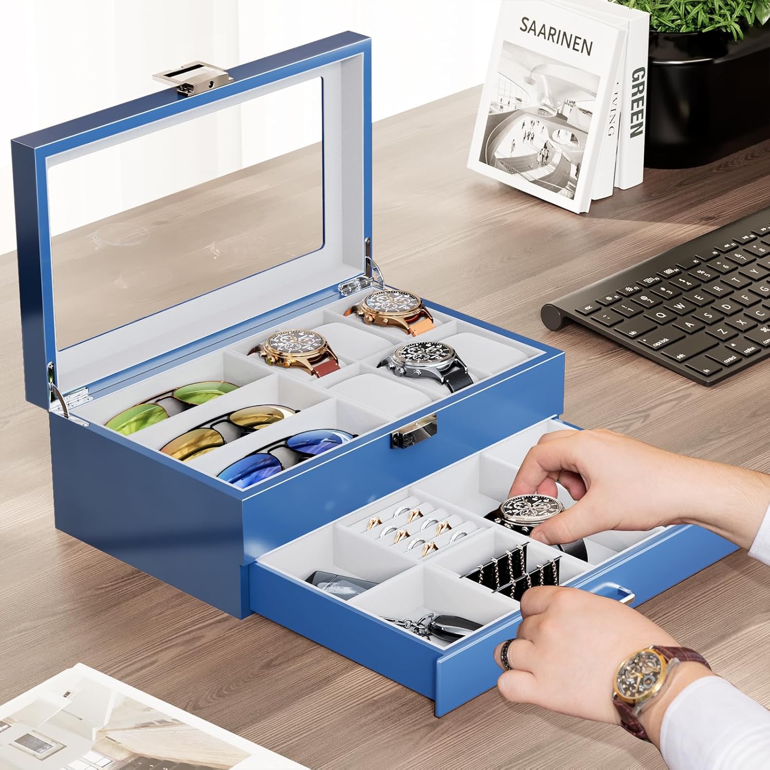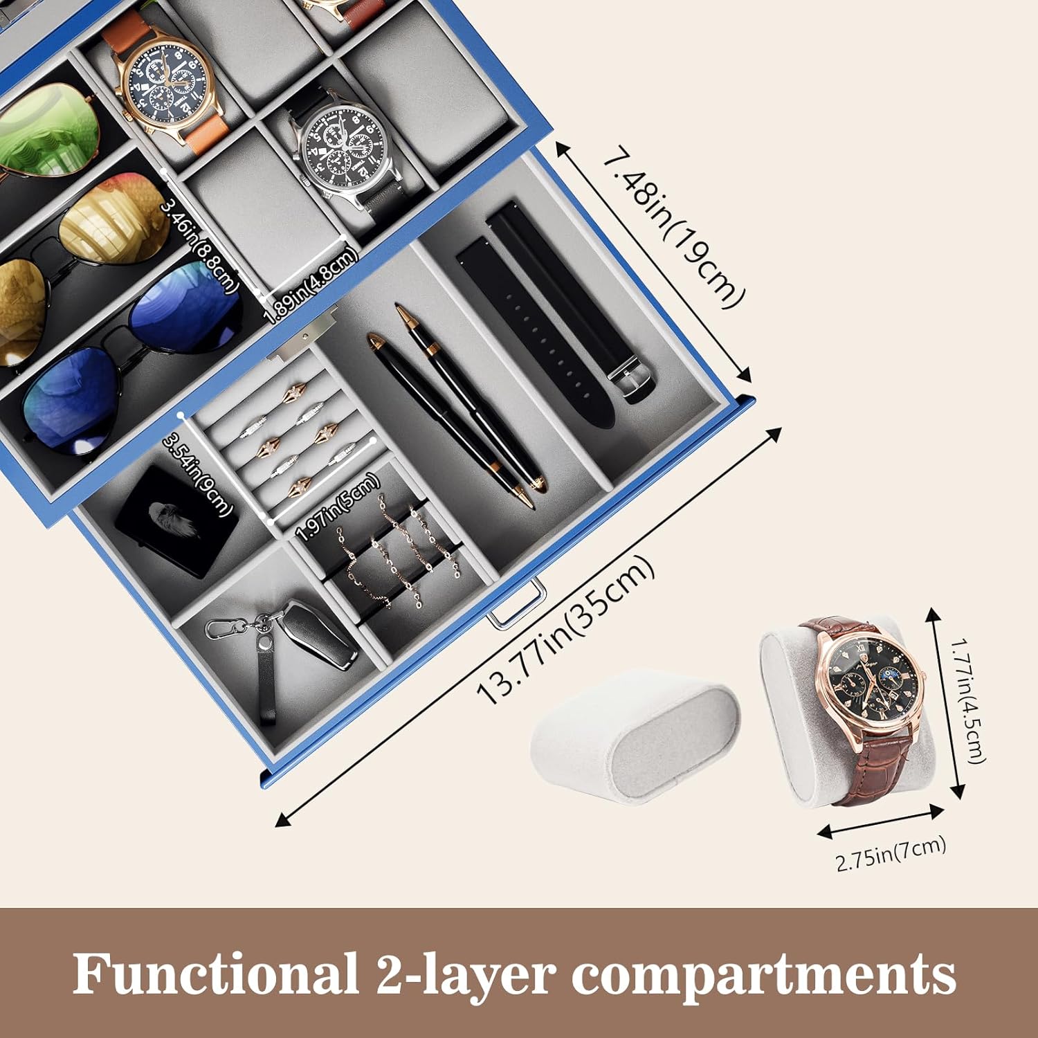 - ⌚ [Zweistöckiges Design] 6 Fächer für Uhren und 3 Positionen für Brillen auf der obersten Ebene; Jedes Uhrenfach (8,9 x 5 x 5 cm) hat ein herausnehmbares Kissen, das eine kleine oder grosse Uhr