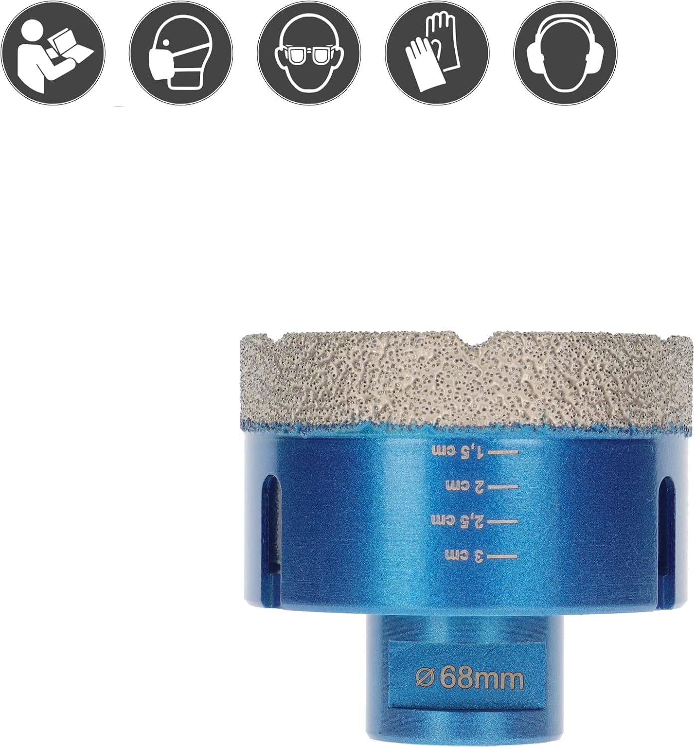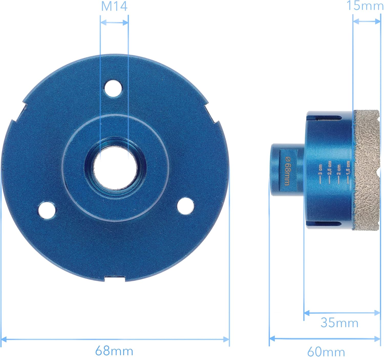- Fliesenbohrer ø 68mm Durchmesser, M14 Aufnahme, Diamant Trockenbohrer mit Premium Vakuum Diamantsegment, 15mm Diamantbeschichtung, 35mm Nutzlänge, passend für handelsübliche Winkelschleifer mit M14 Spindel