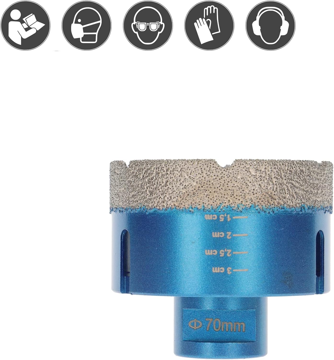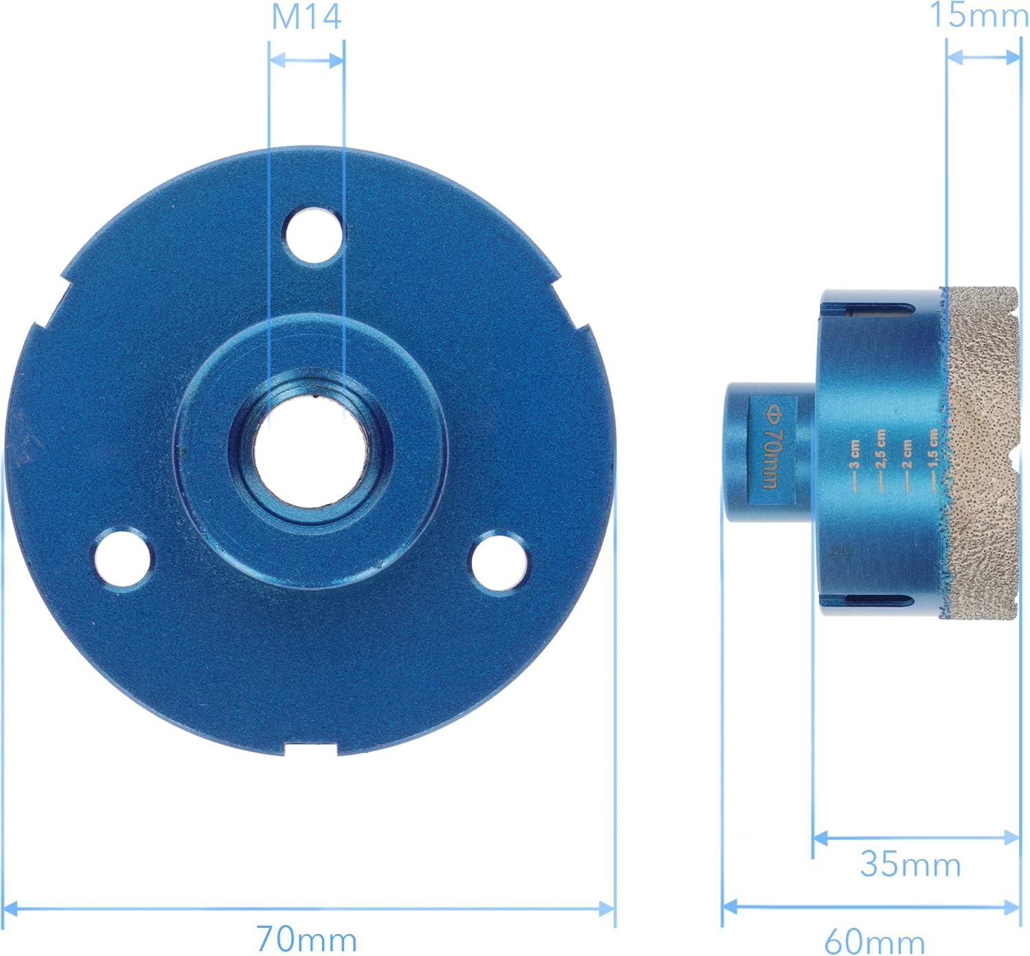 - Fliesenbohrer ø 70mm Durchmesser, M14 Aufnahme, Diamant Trockenbohrer mit Premium Vakuum Diamantsegment, 15mm Diamantbeschichtung, 35mm Nutzlänge, passend für handelsübliche Winkelschleifer mit M14 Spindel