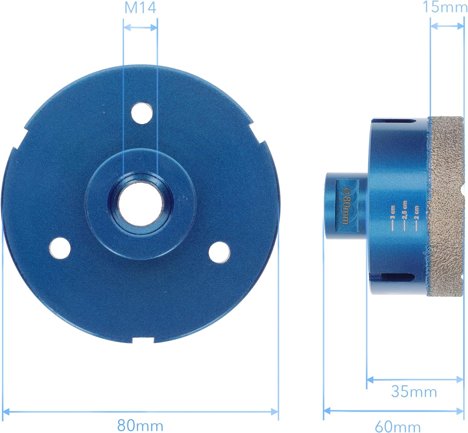 - Fliesenbohrer ø 80mm Durchmesser, M14 Aufnahme, Diamant Trockenbohrer mit Premium Vakuum Diamantsegment, 15mm Diamantbeschichtung, 35mm Nutzlänge, passend für handelsübliche Winkelschleifer mit M14 Spindel