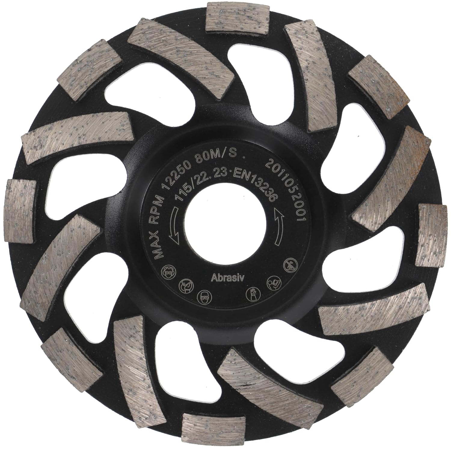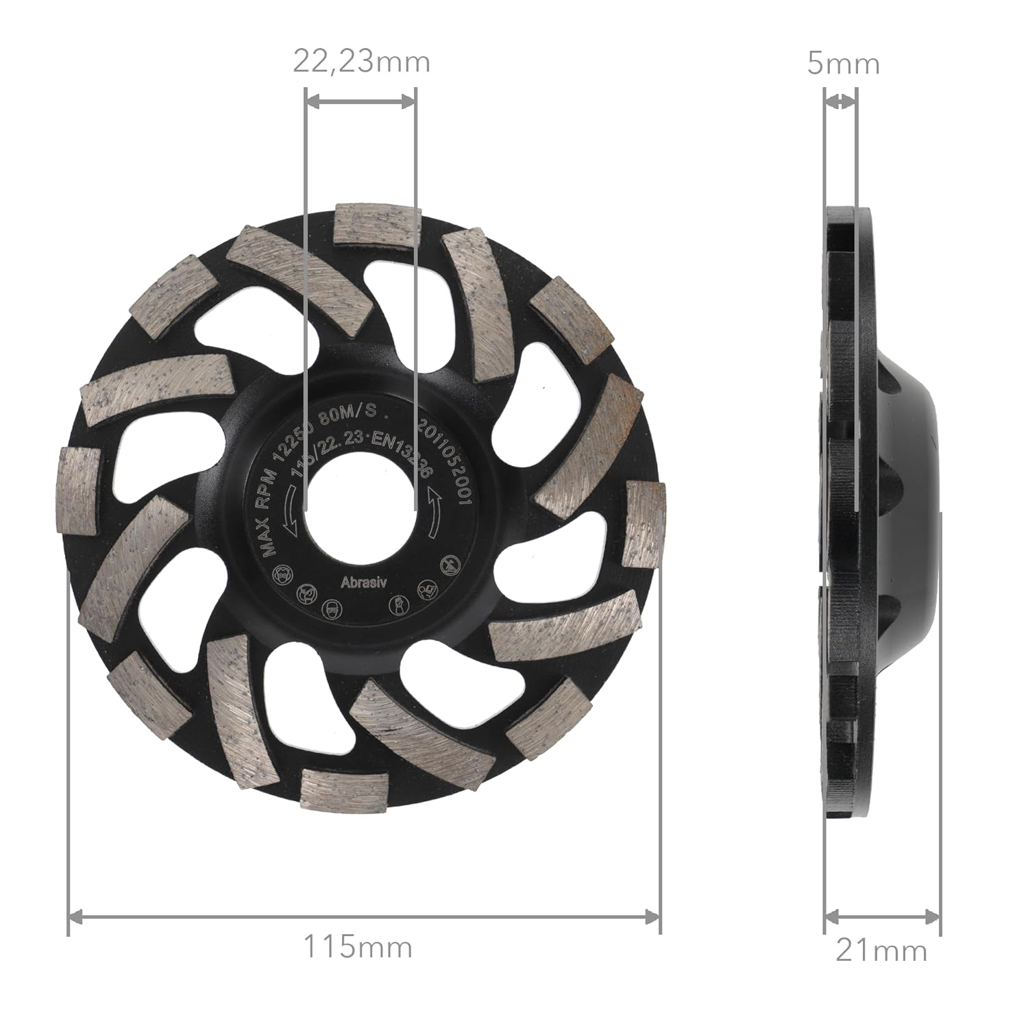 • TECHNISCHE DATEN: Diamant Topfschleifer 115mm mit 16 Segmente der höchsten Güteklasse. Bauhöhe 20mm, Segmenthöhe 5mm Aufnahmebohrung 22,23mm (entspricht M14). Die spezielle Anordnung der Segmente nutz den Drehimpuls und bedient den Luftsog der