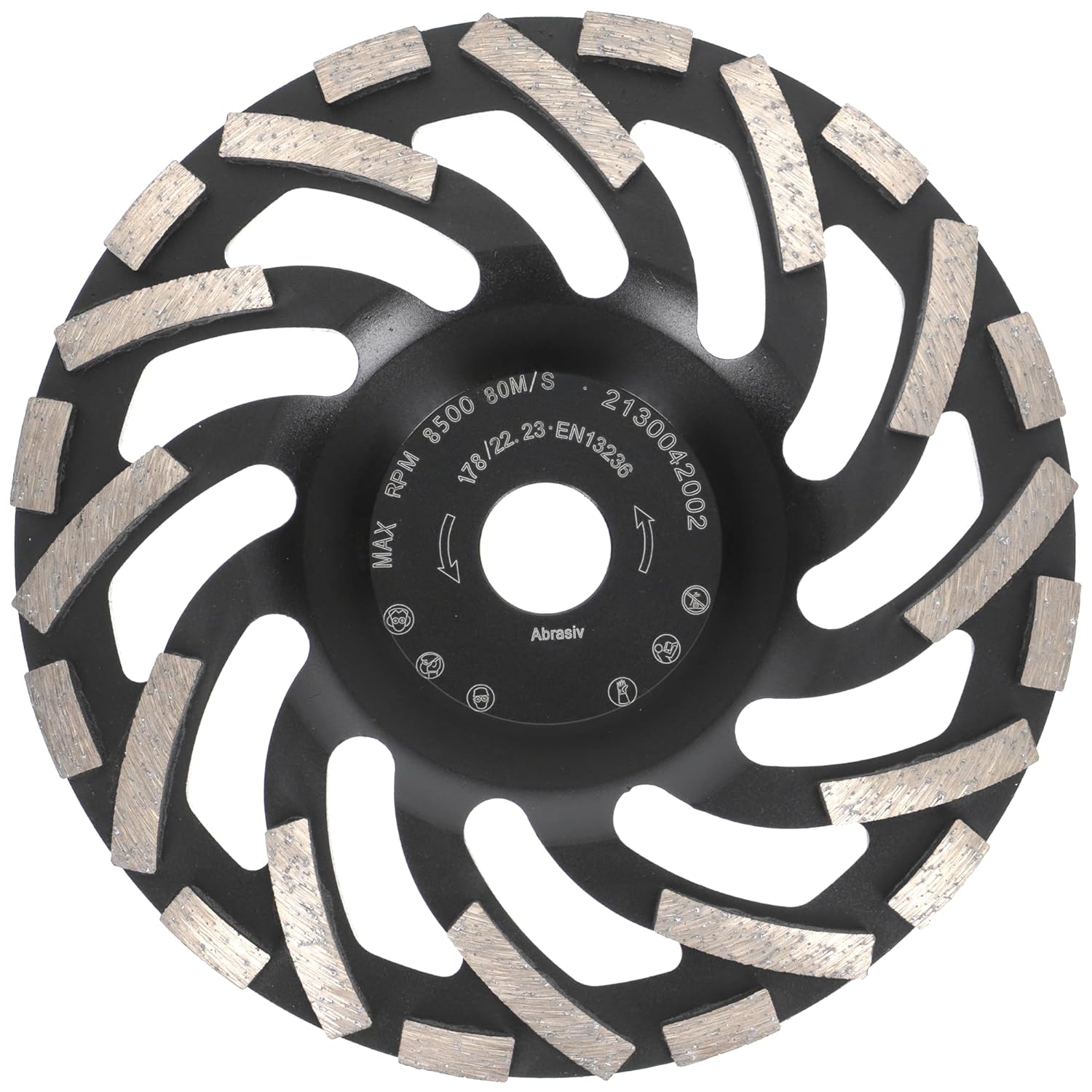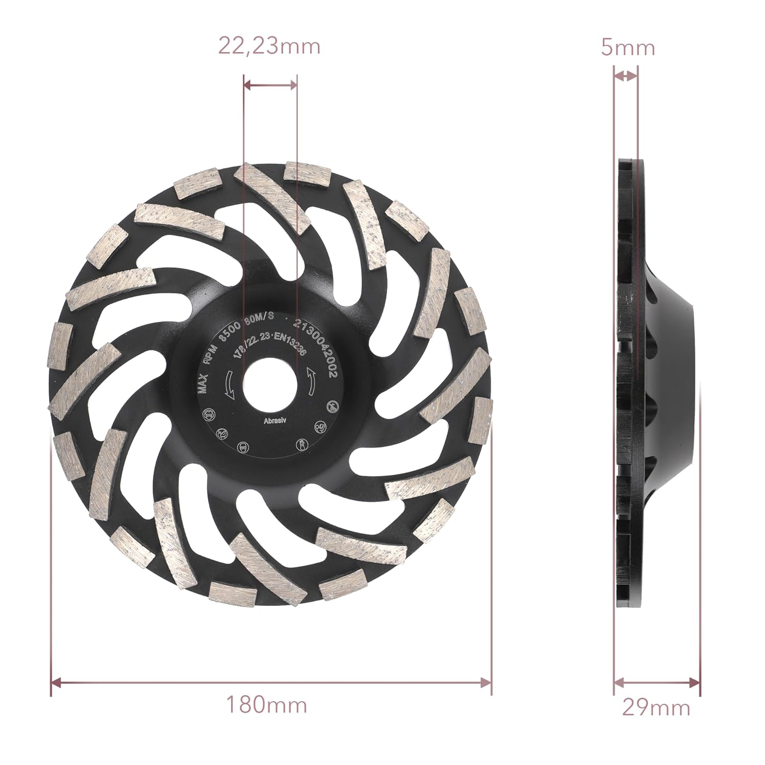 • TECHNISCHE DATEN: Diamant Topfschleifer 180mm mit 24 Segmente der höchsten Güteklasse. Bauhöhe 29mm, Segmenthöhe 5mm Aufnahmebohrung 22,23mm (entspricht M14). Die spezielle Anordnung der Segmente nutz den Drehimpuls und bedient den Luftsog der