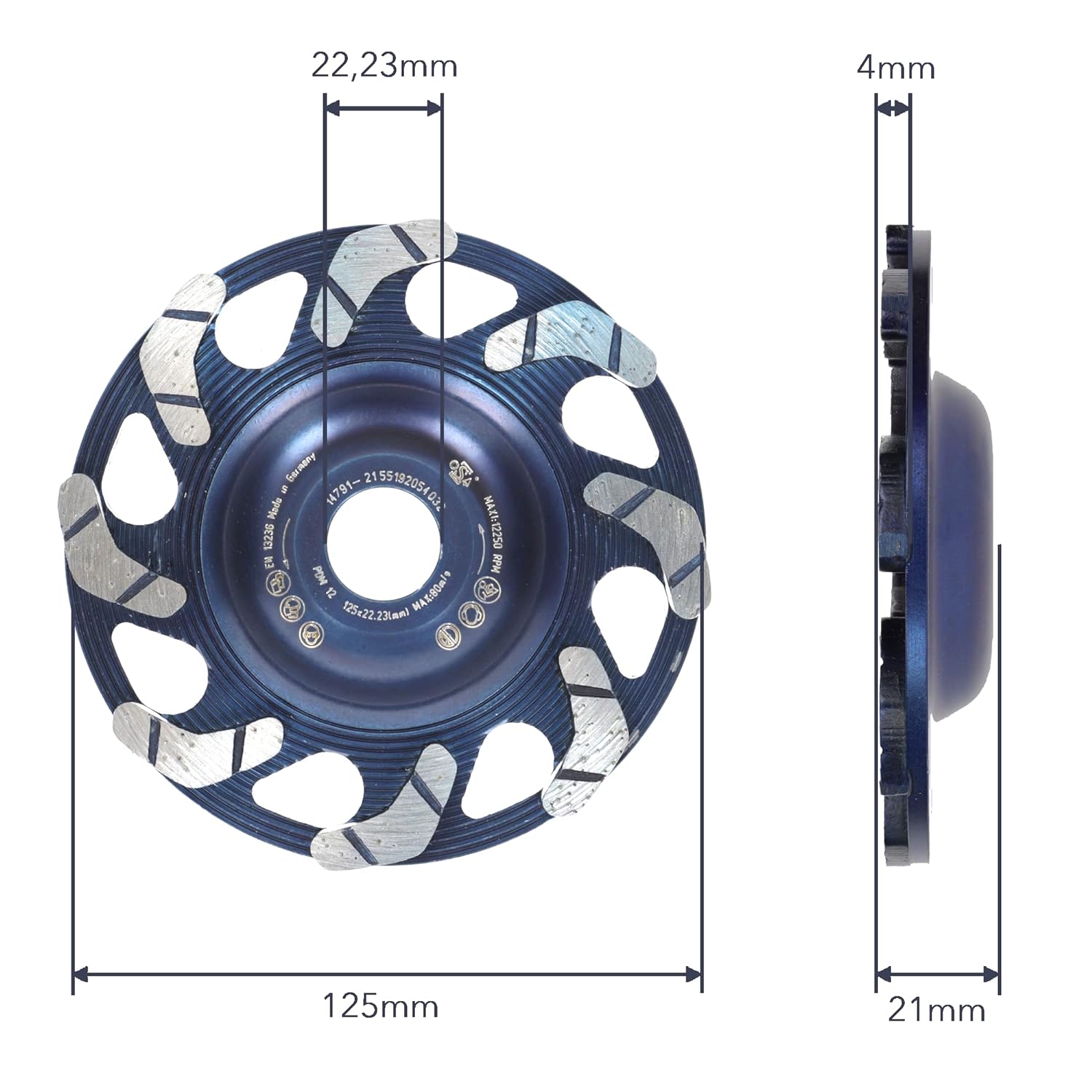 • 125mm Topfschleifer, 22,23mm Bohrung für M14 Winkelschleifer, geschmiedete Diamant-Segmente induktionsverschweisst, universeller Segmentbindung, grobes Industriediamantkorn für Dienstleister und permanente handwerkliche Beanspruchung