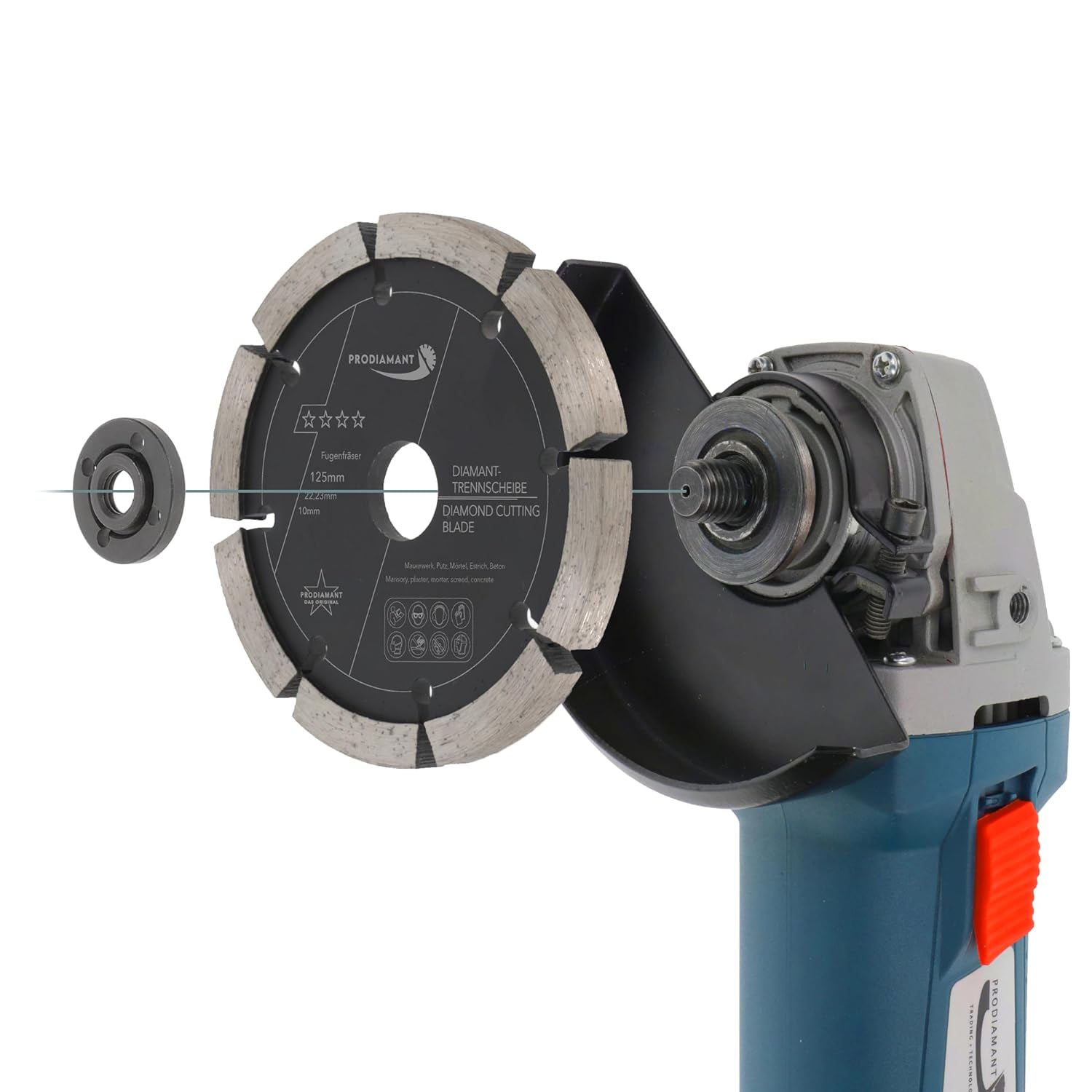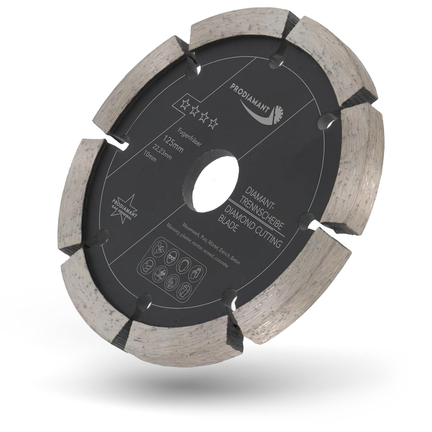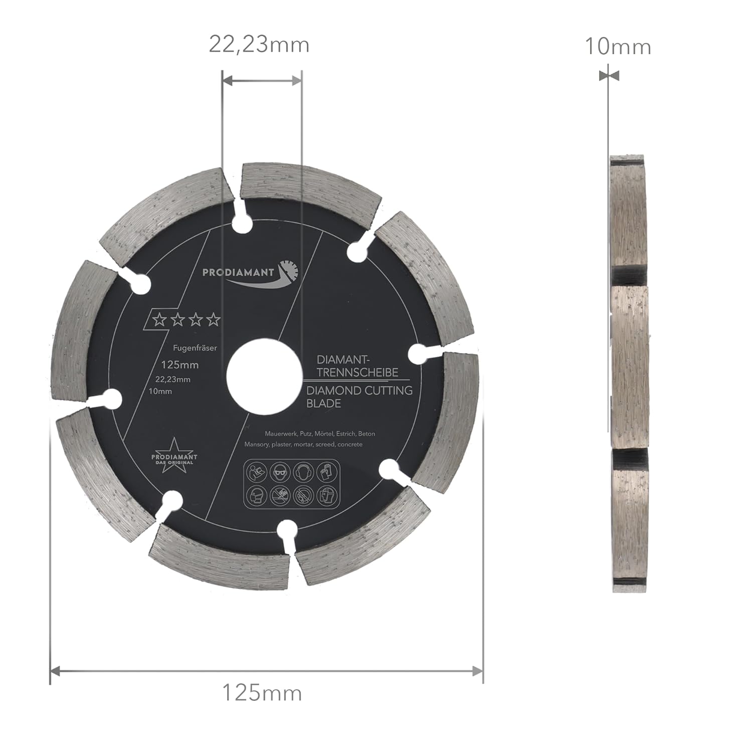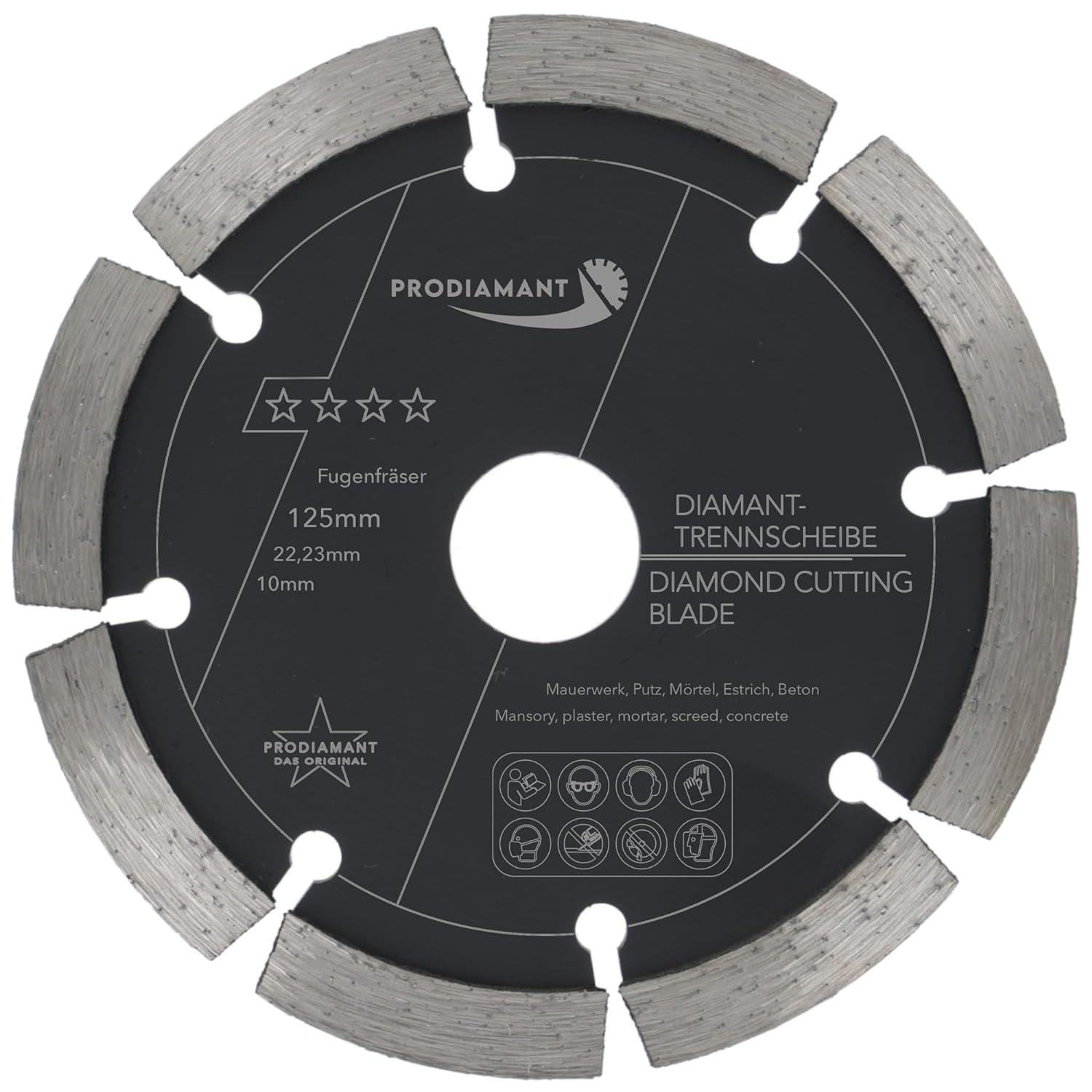 - EIGENSCHAFTEN: Diamantfräser 125mm Durchmesser, Fugenbreite 10mm, Bohrung 22,23mm, Segmenthöhe 10mm. Die PRODIAMANT Frässcheibe ist perfekt geeignet zum Fräsen Schlitzen Sanieren von Fugen und Klinker.