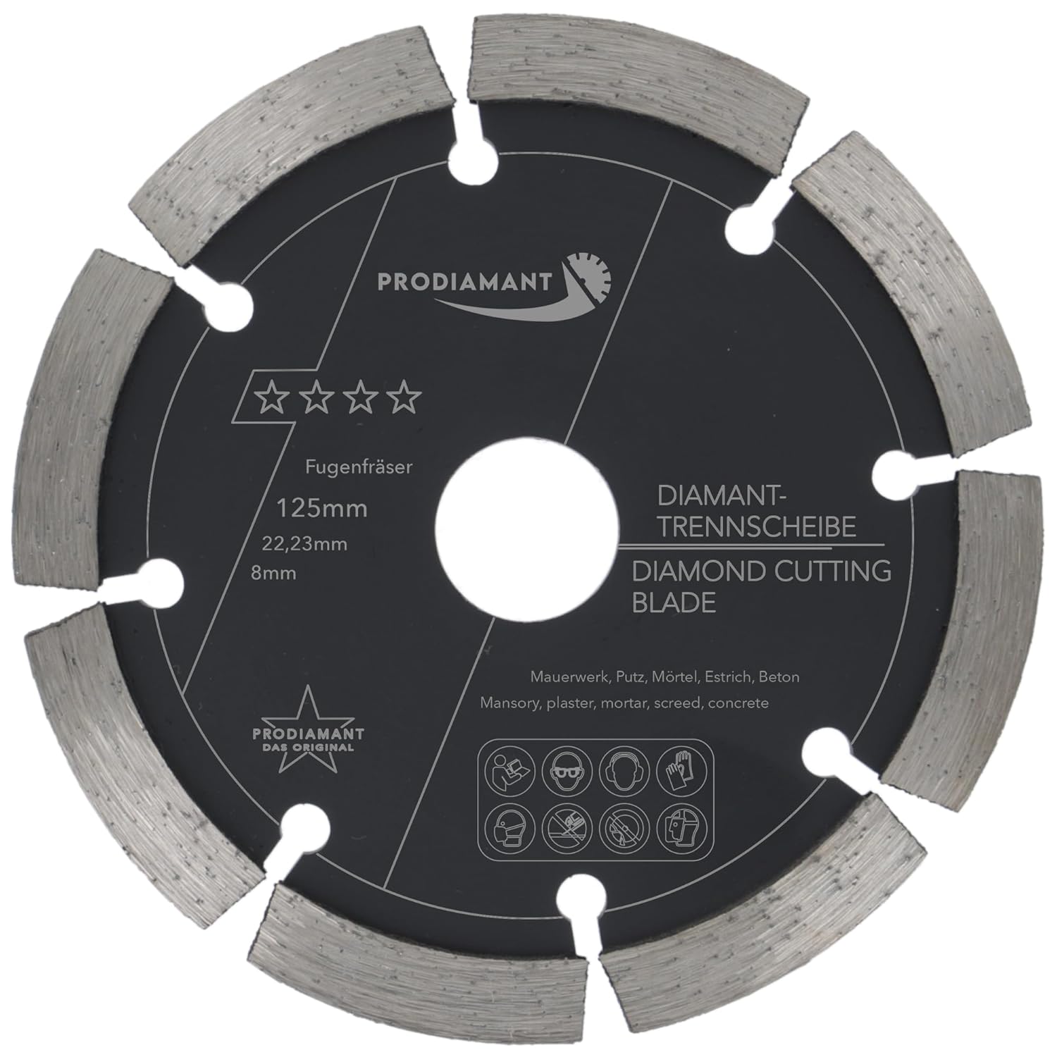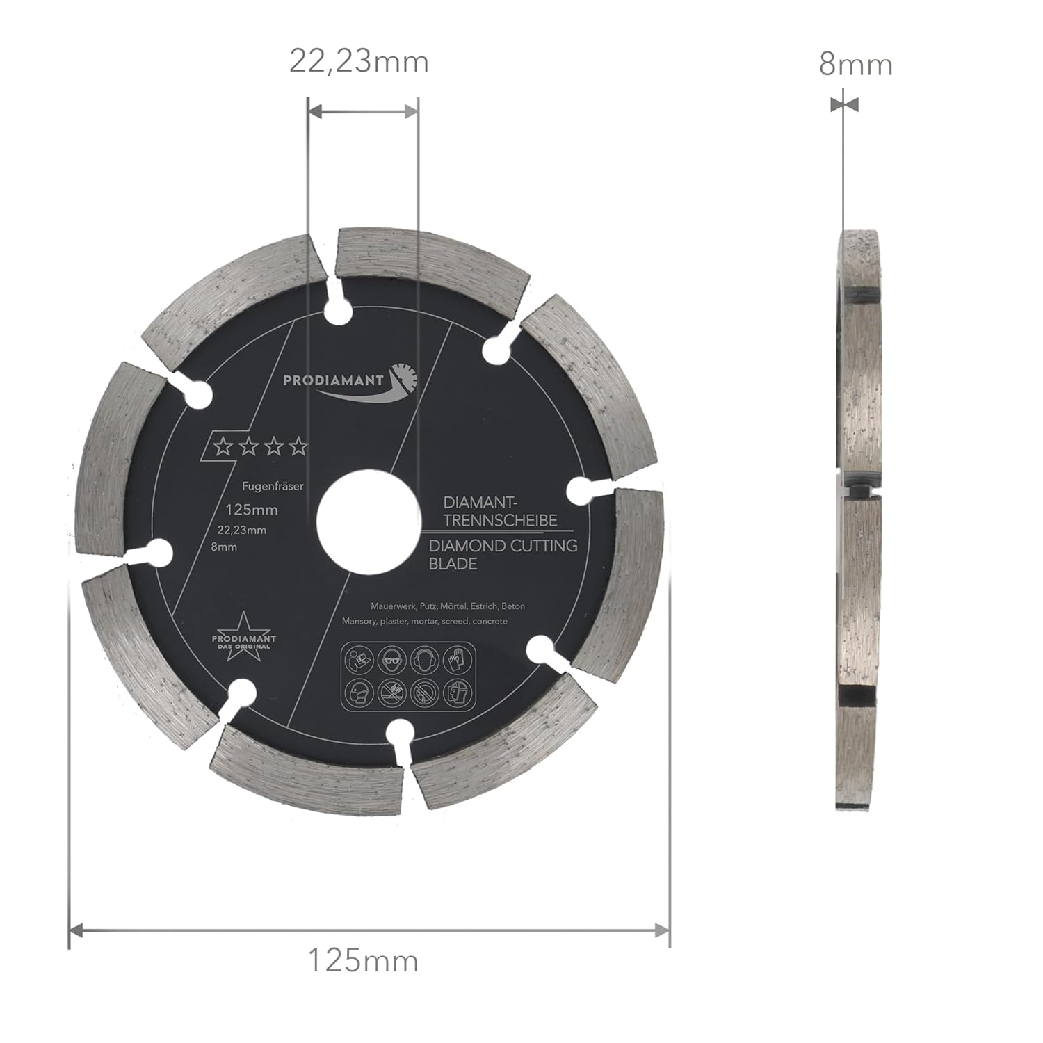 - EIGENSCHAFTEN: Diamantfräser 125mm Durchmesser, Fugenbreite 8mm, Bohrung 22,23mm, Segmenthöhe 10mm. Die PRODIAMANT Frässcheibe ist perfekt geeignet zum Fräsen Schlitzen Sanieren von Fugen und Klinker.
