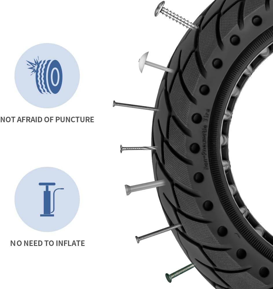 - Wabendesign zur Stossdämpfung: Vollgummireifen für Fahrten auf unebenen Strassen geeignet. Diese Reifen sind mit Wabenlöchern versehen, um sicherzustellen, dass die Reifen Stösse besser absorbieren als andere Vollreifen und für Elektroroller
