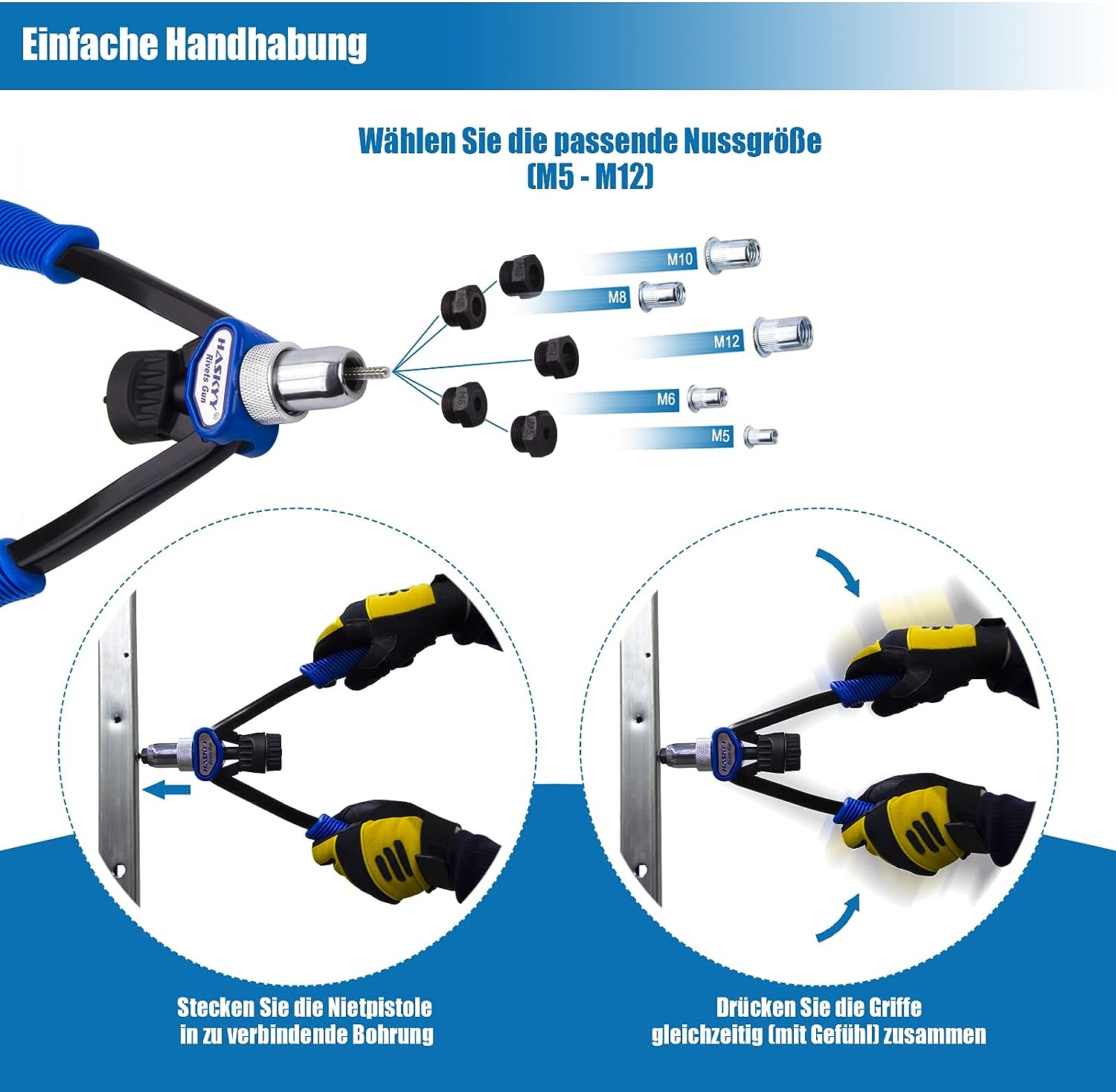 - ✔ Mundstück in den Grössen: M5-M6-M8-M10-M12 ✔ inkl. Flachschlüssel zum Umbau der Zange ✔ inkl. Nietmuttern-Sortiment (150 Stück)