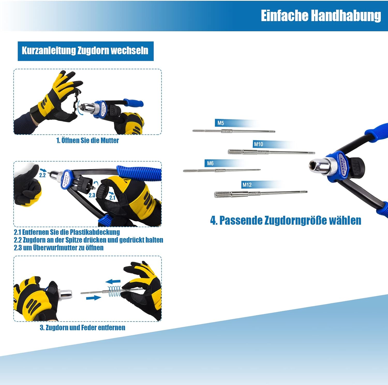 - ✔ 5 wechselbare VERBESSERTE* vernickelte Zugdorne in den Grössen: M5-M6-M8-M10-M12 5 ✔ geeignet für Nietmuttern aus Edelstahl, Stahl und Aluminium