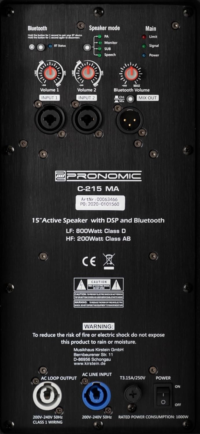 - Woofer: 15" (381 mm), Hochtöner: 1,75" Titanium, SPL: 123 dB, DSP: 48 kHz/24 bit, Klirrfaktor: ≤0,05%