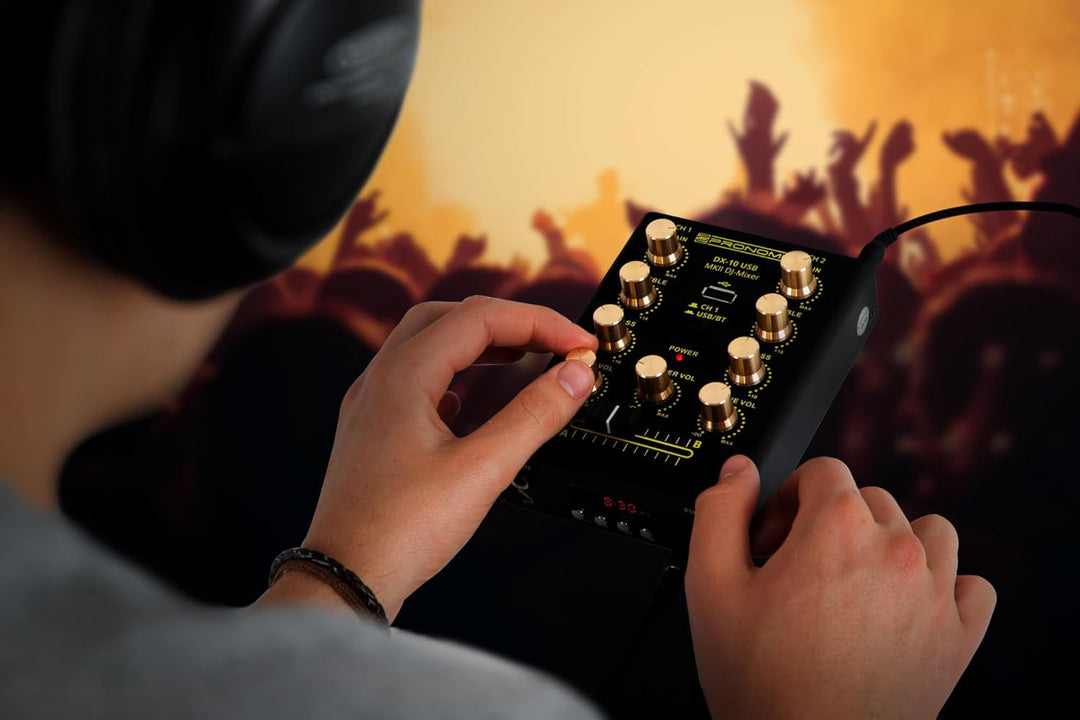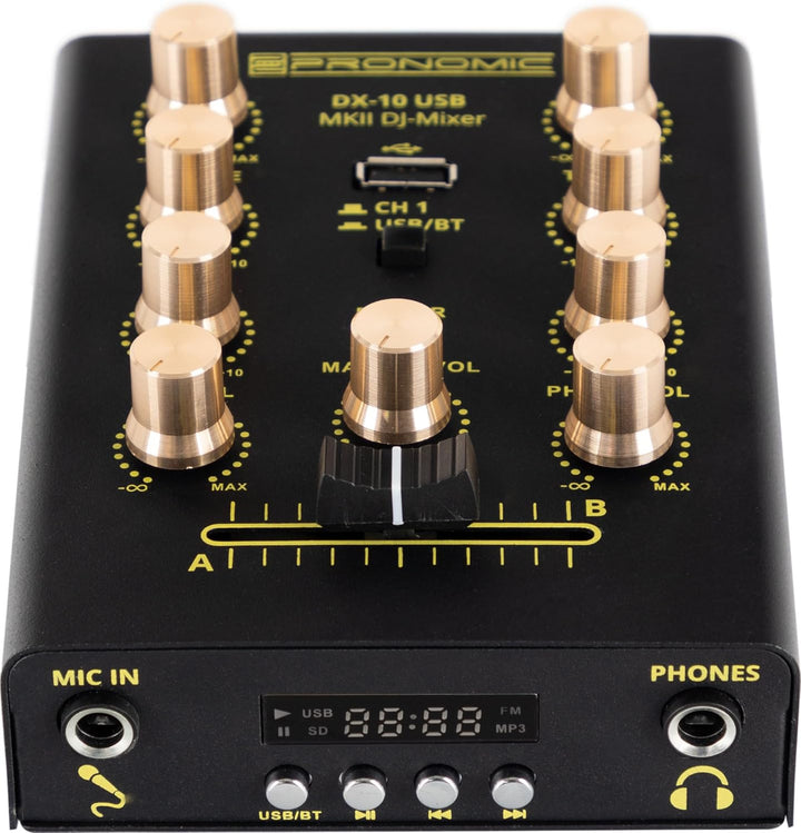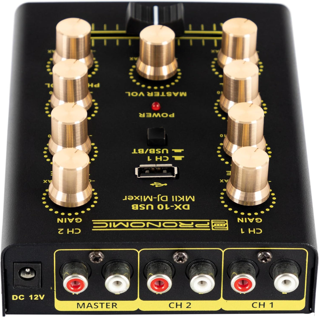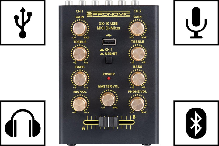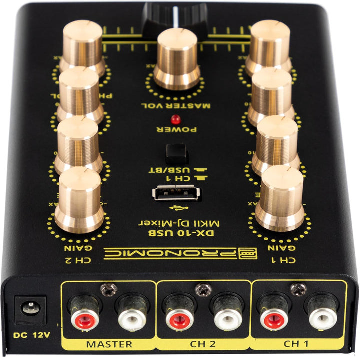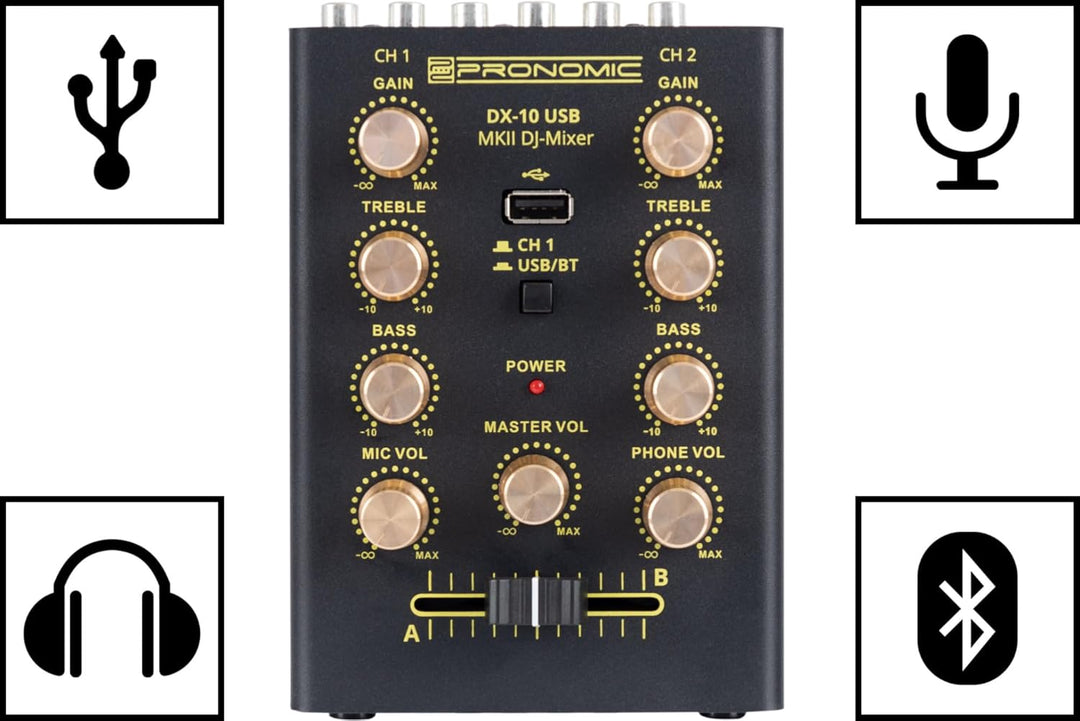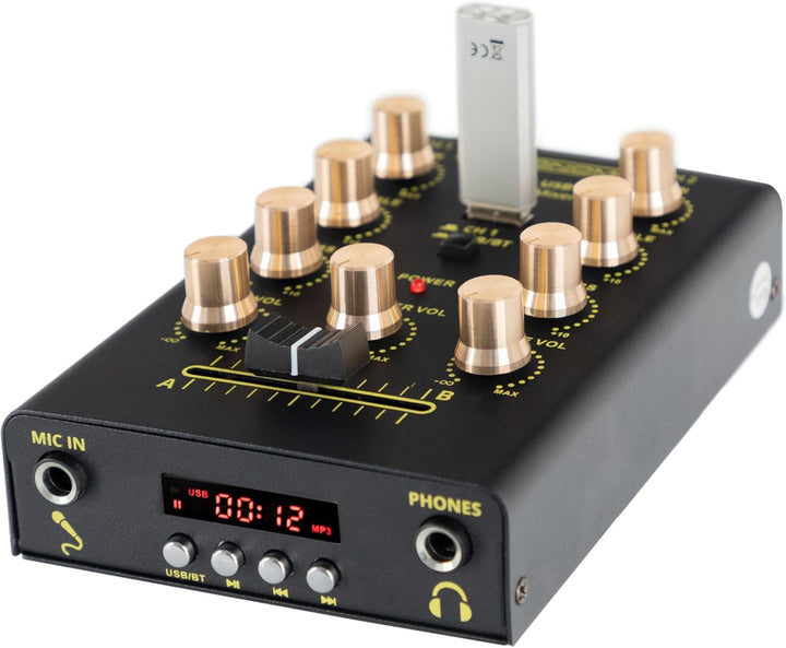 - Ultrakompakter 2-Kanal DJ-Mixer, Gain-Regler und 2-Band Equalizer je Kanal