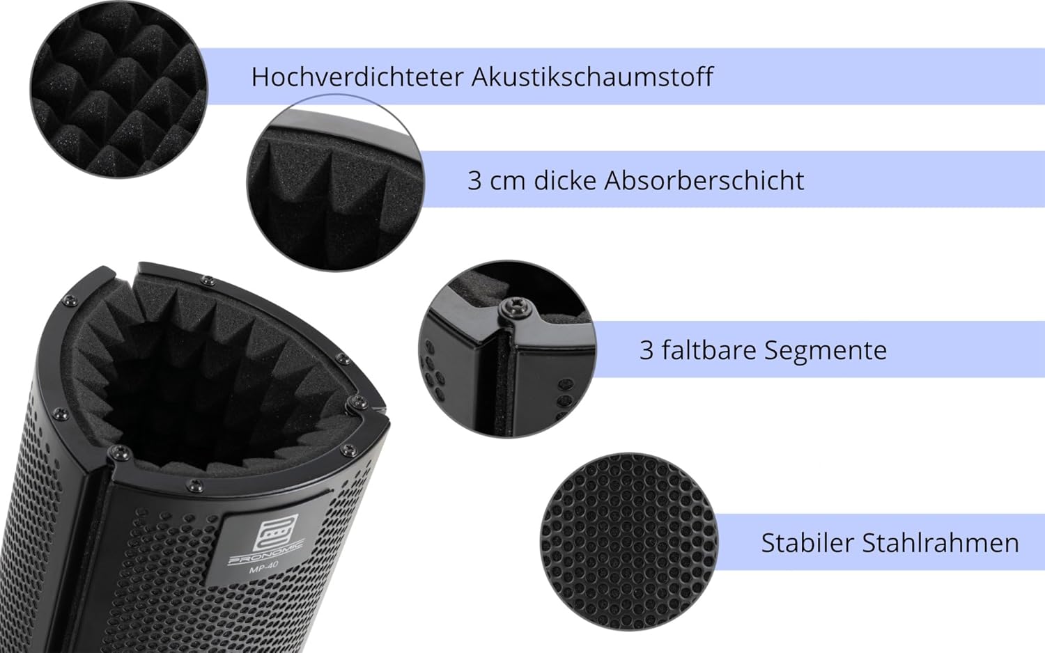 - 2 Gelenke für platzsparende Aufbewahrung, Absorber kann auf alle gängigen Mikrofonstative montiert werden