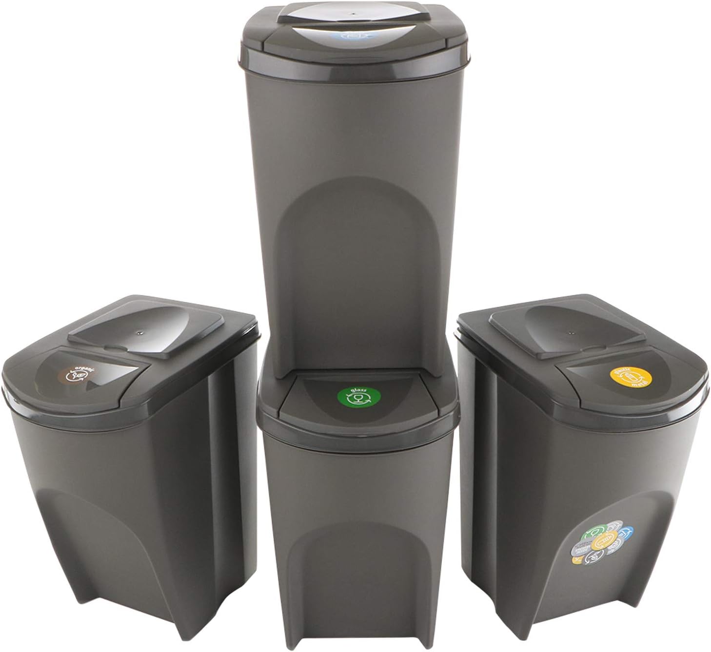 - Durch die farbigen Klappdeckel lassen sich die einzelnen Abfallarten intuitiv sortieren