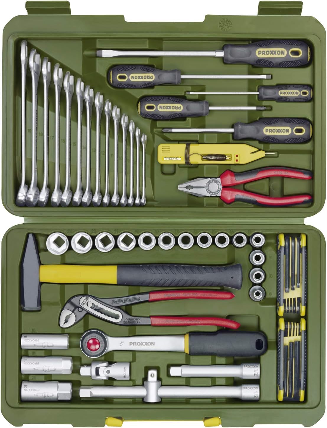 - Lieferumfang: 1 x PROXXON PKW- und Universalwerkzeugkoffer, Gewicht: 7,6 kg, Aussenmasse: 445 x 280 x 115 mm, Artikelnummer: 23650