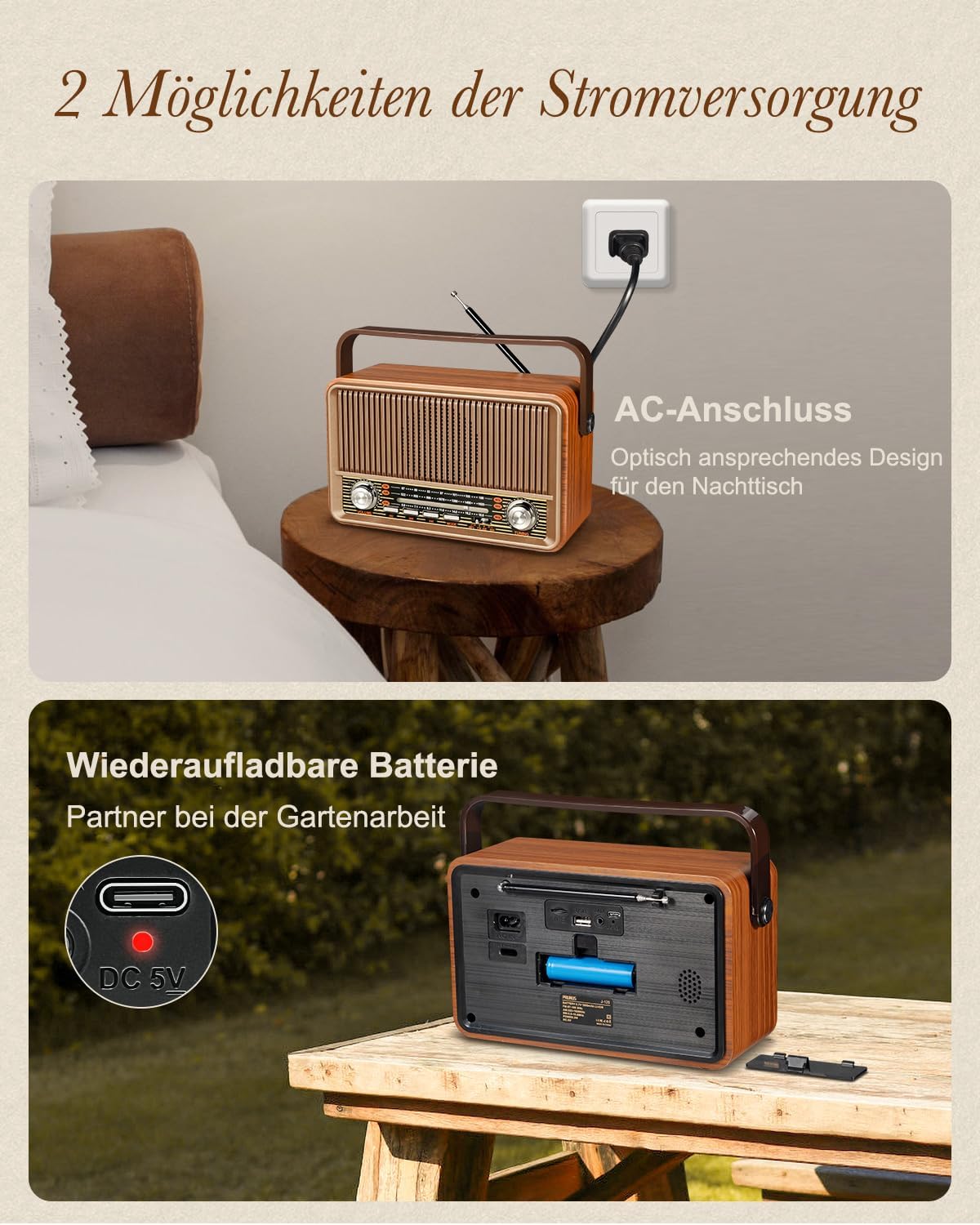 • 【2 Möglichkeiten der Stromversorgung】Der 1800 mAh Akku mit grosser Kapazität und die AC-Stromversorgung stellen sicher, dass dieses kleines Radio mit akku sowohl für drinnen als auch draussen geeignet ist. Wenn Sie campen gehen oder im Garten