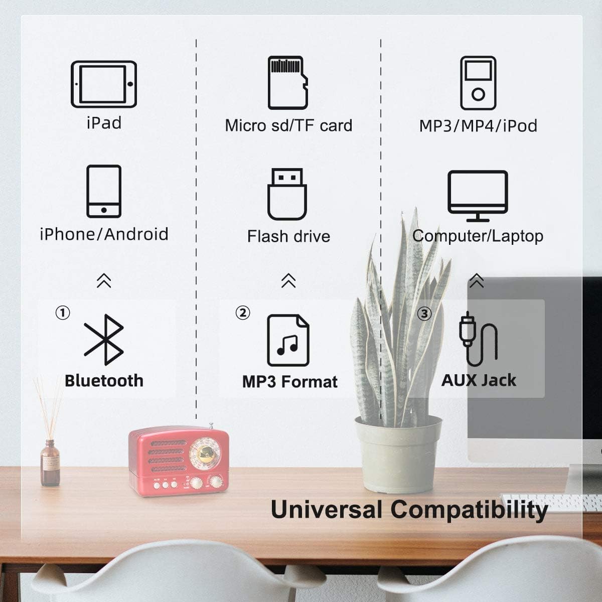 - ♥Perfektes Musikerlebnis: 1) Unser küchenradio retro unterstützt Flash-USB und TF-Karte (0-32GB). Bedeutet, dass es eine zusätzliche MP3-Funktion hat. 2) Mit AUX- und Bluetooth-Funktion (10m). Das Bluetooth radio vintage kann sogar als Lautsprecher Ihres Telefons oder Computers funktionieren. 3) Ausgestattet mit einem eingebauten 3W-Magnetlautsprecher, der einen zuverlässigen tiefen Bass und sanfte Höhen liefert. (★Hinweis: keine Kopfhörerbuchse & keine Unterstützung für Bluetooth-Kopfhörer)